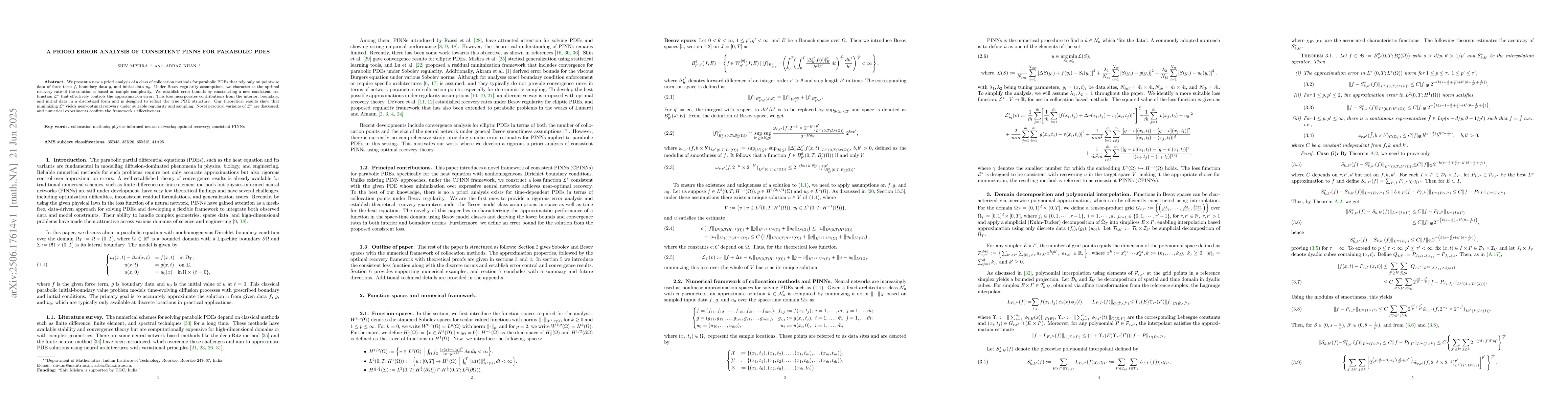 The research employs a priori error analysis for consistent Physics-Informed Neural Networks (PINNs) applied to parabolic partial differential equations (PDEs). It characterizes the optimal recovery rate of the solution under Besov regularity assumptions, constructing a new consistent loss function that effectively controls the approximation error.