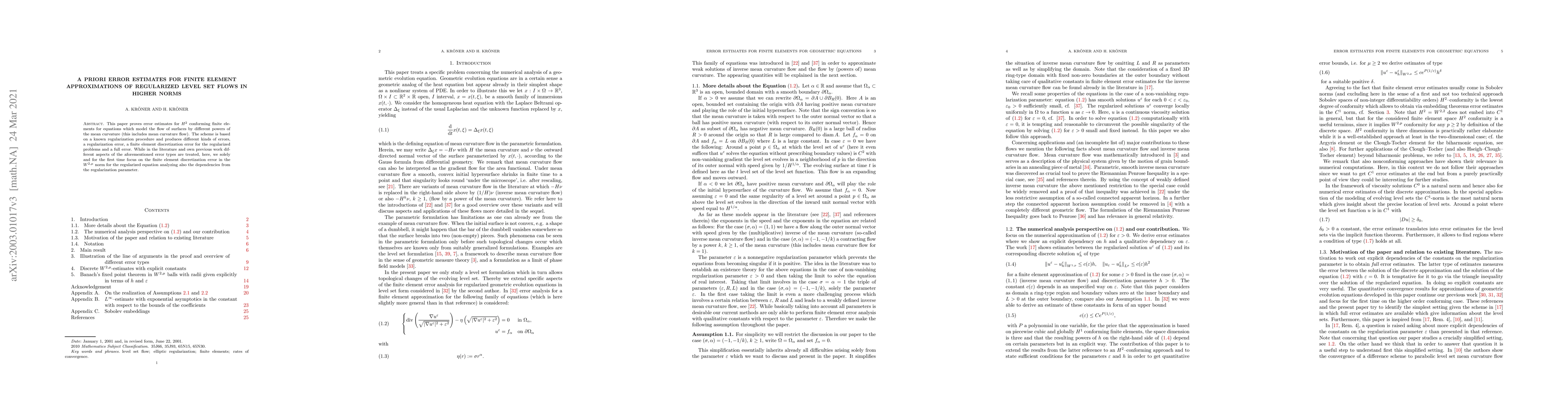 This paper develops error estimates for finite element approximations of regularized level set flows in higher norms, focusing on the discretization error and its dependency on the regularization parameter.