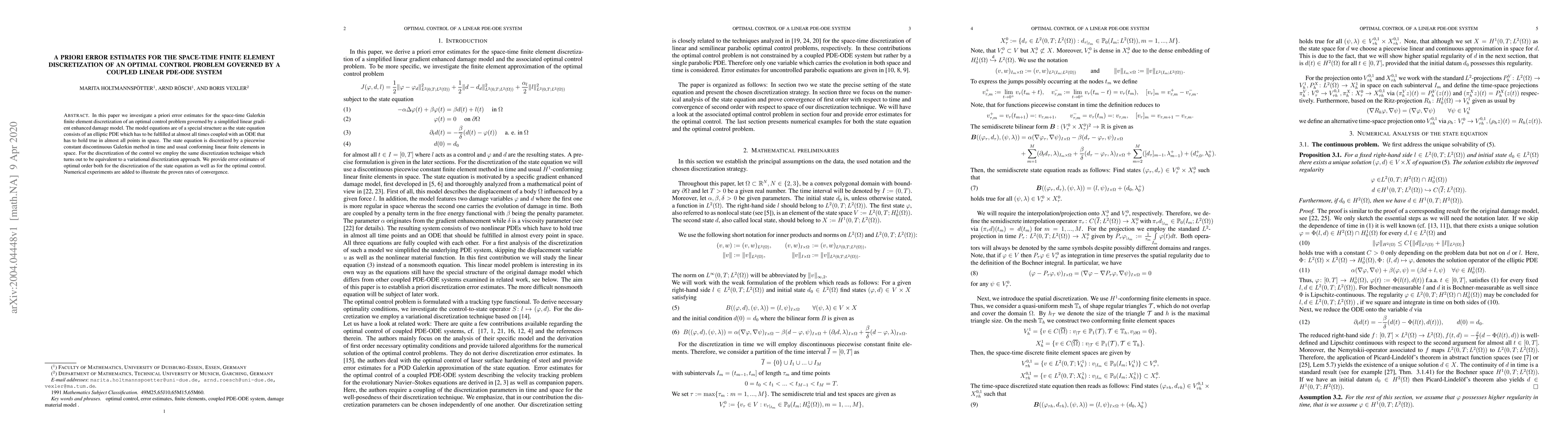 This paper investigates a priori error estimates for the space-time finite element discretization of an optimal control problem governed by a coupled linear PDE-ODE system. The authors provide optimal order error estimates for both the state equation and the control using a discontinuous Galerkin method in time and conforming linear finite elements in space, supported by numerical experiments.