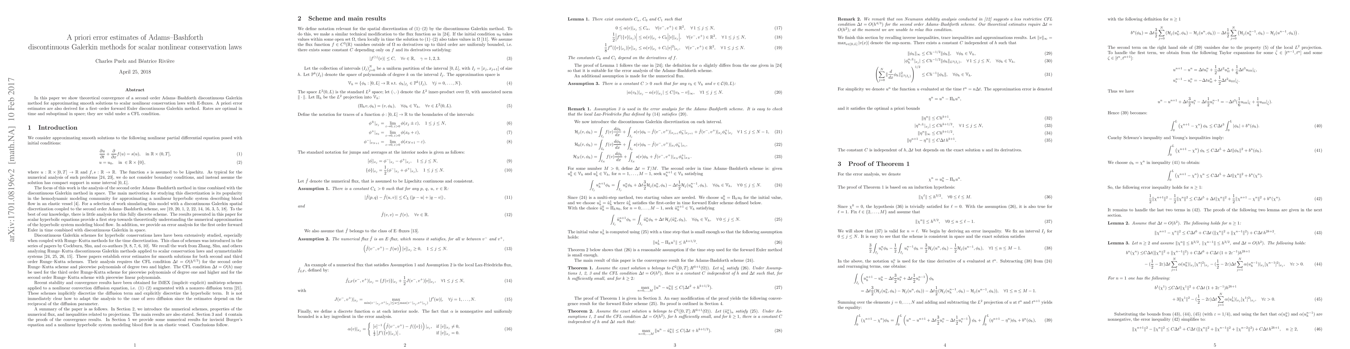 In this paper we show theoretical convergence of a second-order Adams-Bashforth discontinuous Galerkin method for approximating smooth solutions to scalar nonlinear conservation laws with E-fluxes. A priori error estimates are also derived for a first-order forward Euler discontinuous Galerkin method. Rates are optimal in time and suboptimal in space; they are valid under a CFL condition.