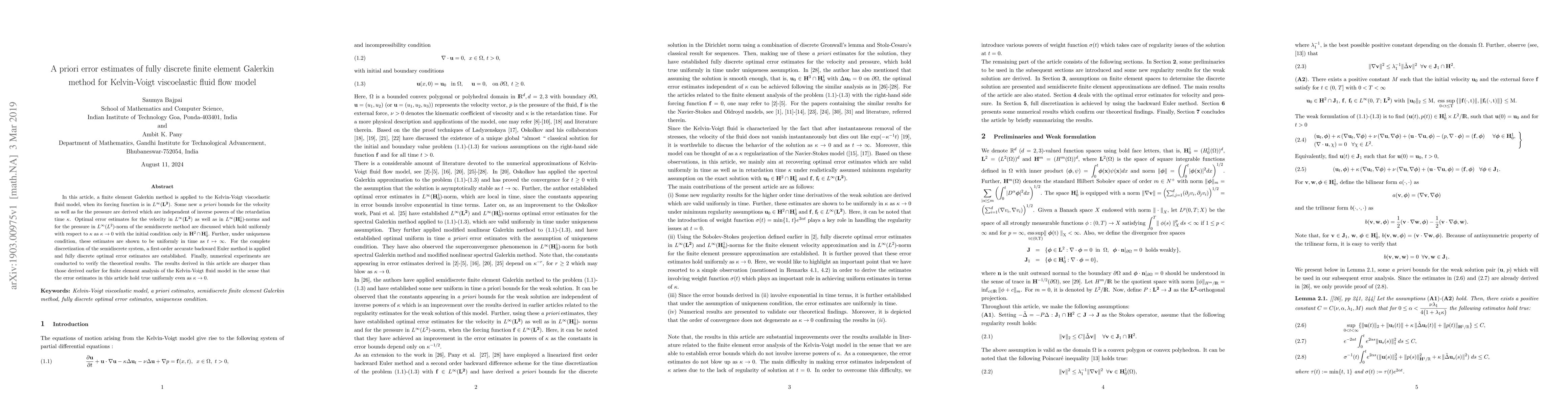 This paper presents new a priori error estimates for a fully discrete finite element Galerkin method applied to the Kelvin-Voigt model of viscoelastic fluid flow, showing optimal error bounds independent of the small retardation time $\kappa$. Numerical experiments confirm the theoretical results, providing sharper estimates than previous analyses.