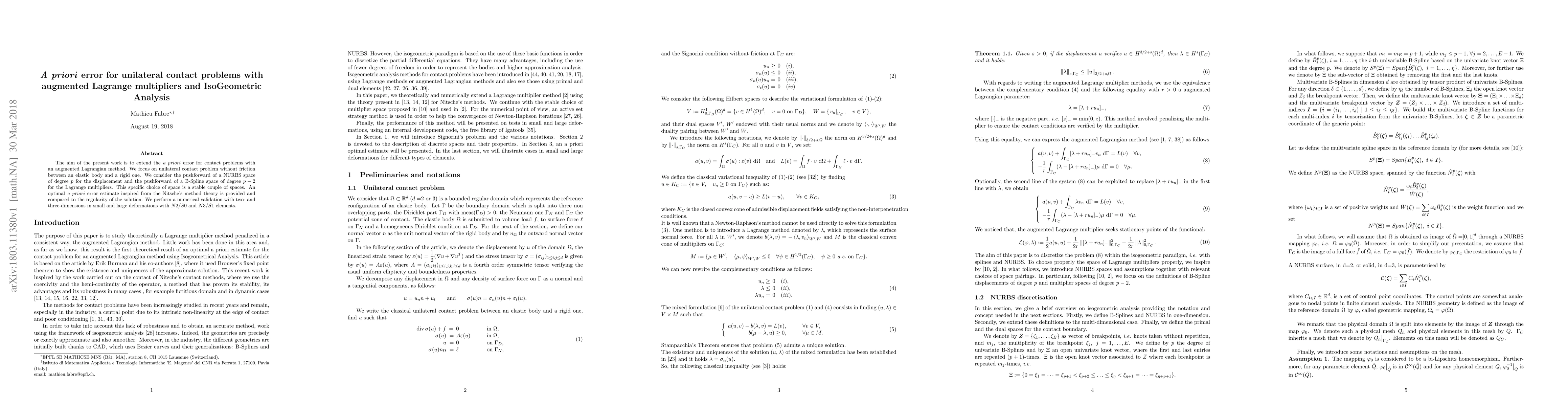 The paper extends a priori error analysis for unilateral contact problems using an augmented Lagrangian method with IsoGeometric Analysis (IGA). It focuses on the contact between an elastic body and a rigid one, employing specific spaces for displacement and Lagrange multipliers.