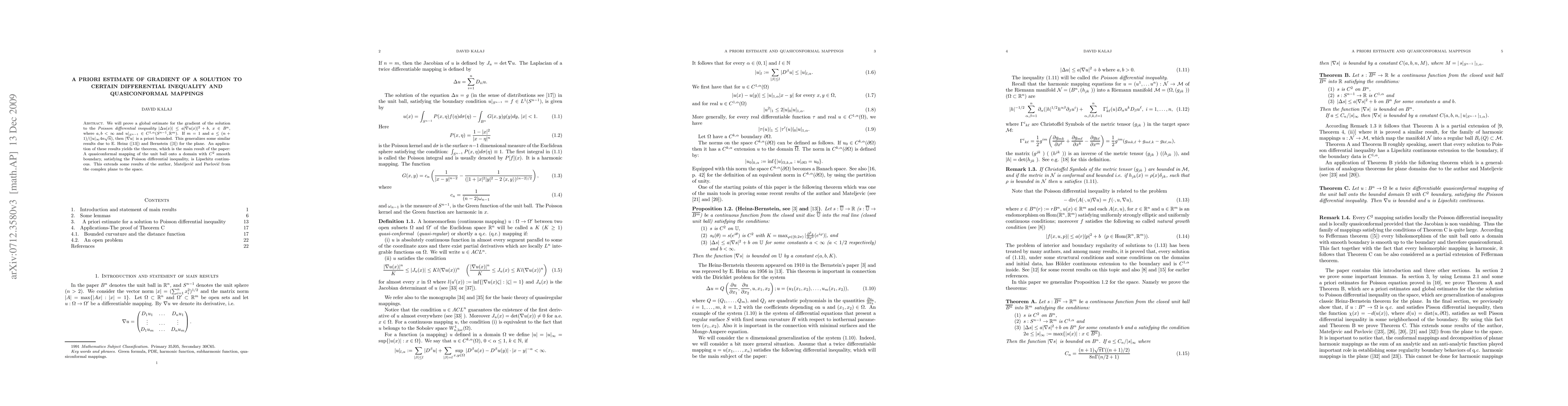 We will prove a global estimate for the gradient of the solution to the {\it Poisson differential inequality} $|\Delta u(x)|\le a|\nabla u(x)|^2+b$, $x\in B^{n}$, where $a,b<\infty$ and $u|_{S^{n-1}}\in C^{1,\alpha}(S^{n-1}, \Bbb R^m)$. If $m=1$ and $a\le (n+1)/(|u|_\infty4n\sqrt n)$, then $|\nabla u| $ is a priori bounded. This generalizes some similar results due to E. Heinz (\cite{EH}) and Bernstein (\cite{BS}) for the plane. An application of these results yields the theorem, which is the main result of the paper: A quasiconformal mapping of the unit ball onto a domain with $C^2$ smooth boundary, satisfying the Poisson differential inequality, is Lipschitz continuous. This extends some results of the author, Mateljevi\'c and Pavlovi\'c from the complex plane to the space.