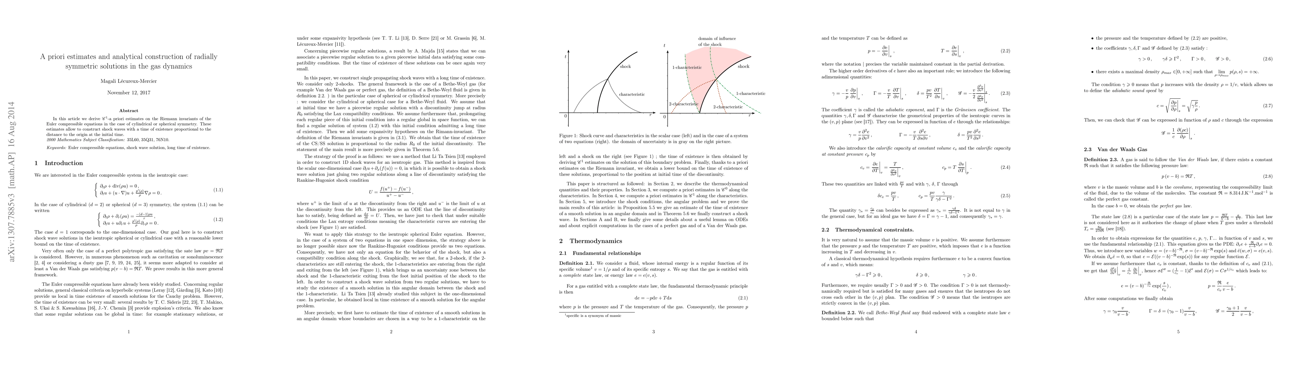 In this article we derive C^1-a priori estimates on the Riemann invariants of the Euler compressible equations in the case of cylindrical or spherical symmetry. These estimates allow then to construct shock waves with a time of existence proportional to the distance to the origin at the initial time.