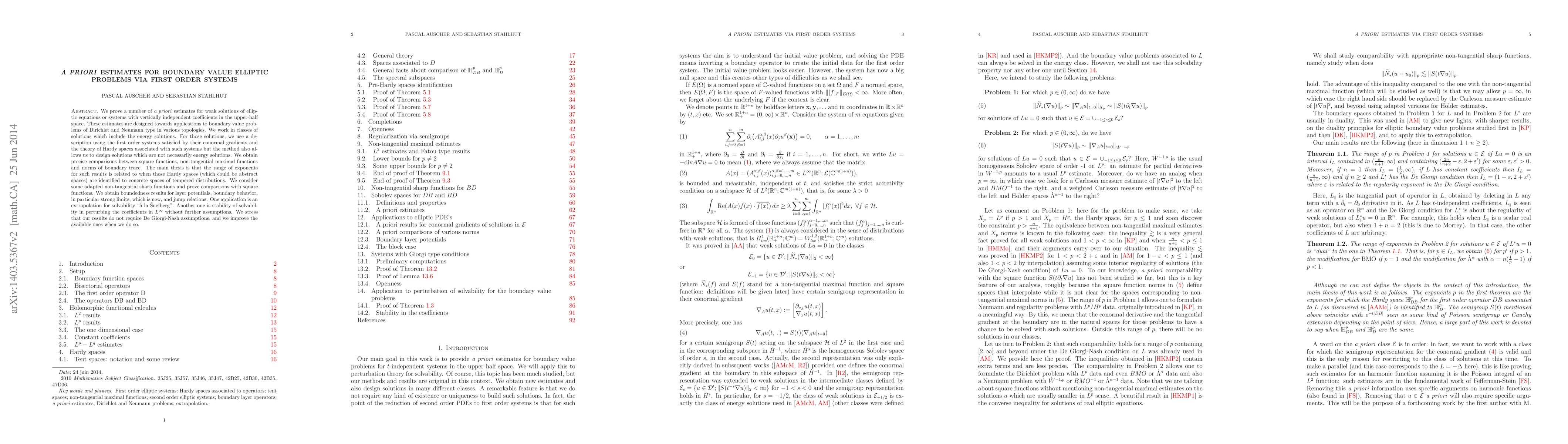 This paper proves a priori estimates for weak solutions of elliptic equations with vertically independent coefficients in the upper-half space, utilizing first-order systems and Hardy spaces. The results include precise comparisons between various function norms and new boundedness for layer potentials, with applications to solvability and stability under perturbations.