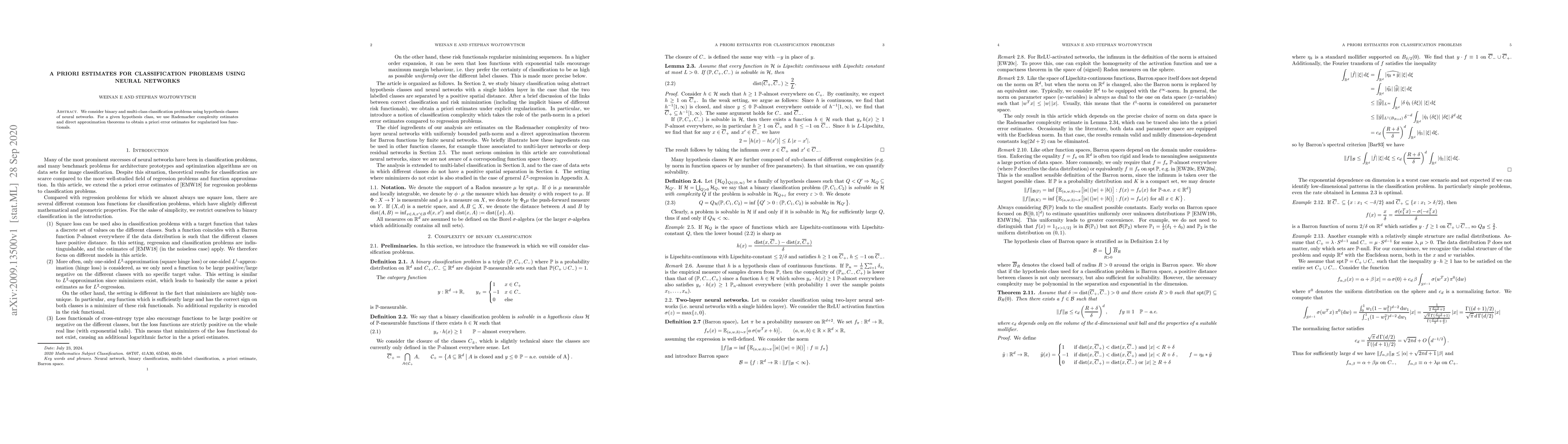 Summary: This paper derives a priori error estimates for neural networks in binary and multi-class classification tasks using Rademacher complexity and approximation theorems, focusing on regularized loss functionals. The results provide insights into the performance of neural networks in classification problems.