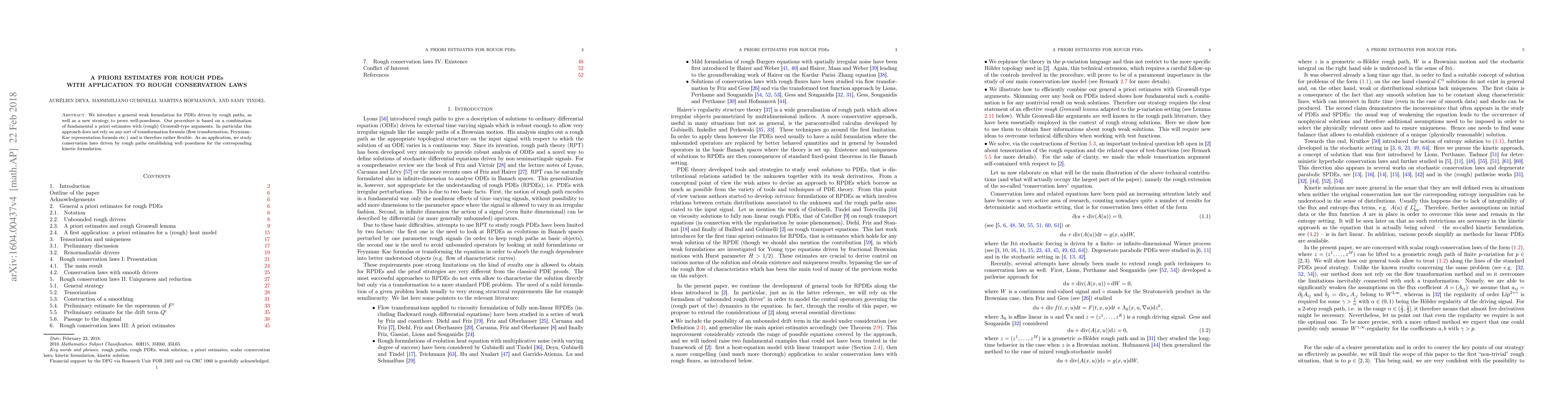 We introduce a general weak formulation for PDEs driven by rough paths, as well as a new strategy to prove well-posedness. Our procedure is based on a combination of fundamental a priori estimates with (rough) Gronwall-type arguments. In particular this approach does not rely on any sort of transformation formula (flow transformation, Feynman--Kac representation formula etc.) and is therefore rather flexible. As an application, we study conservation laws driven by rough paths establishing well--posedness for the corresponding kinetic formulation.