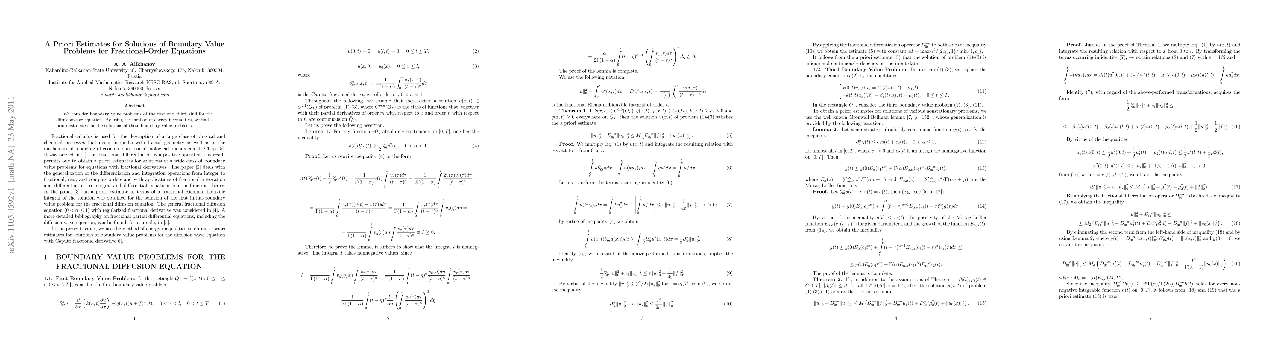 Summary: This paper investigates boundary value problems of the first and third kinds for fractional-order diffusion-wave equations, employing energy inequalities to derive a priori estimates for their solutions. The results provide valuable insights into the behavior of solutions under specified boundary conditions.