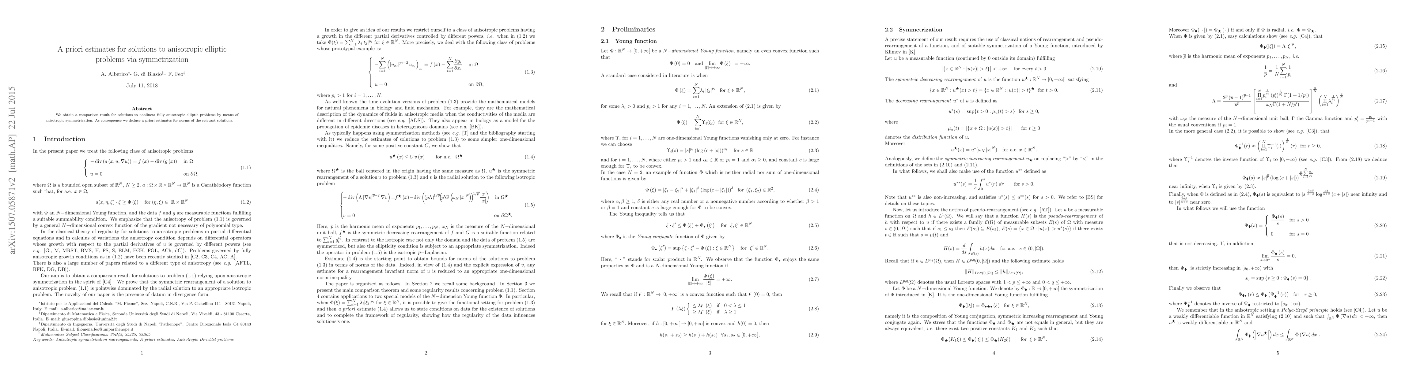 Summary: This paper establishes a comparison result for solutions to nonlinear anisotropic elliptic problems using anisotropic symmetrization, leading to a priori estimates for the norms of these solutions.