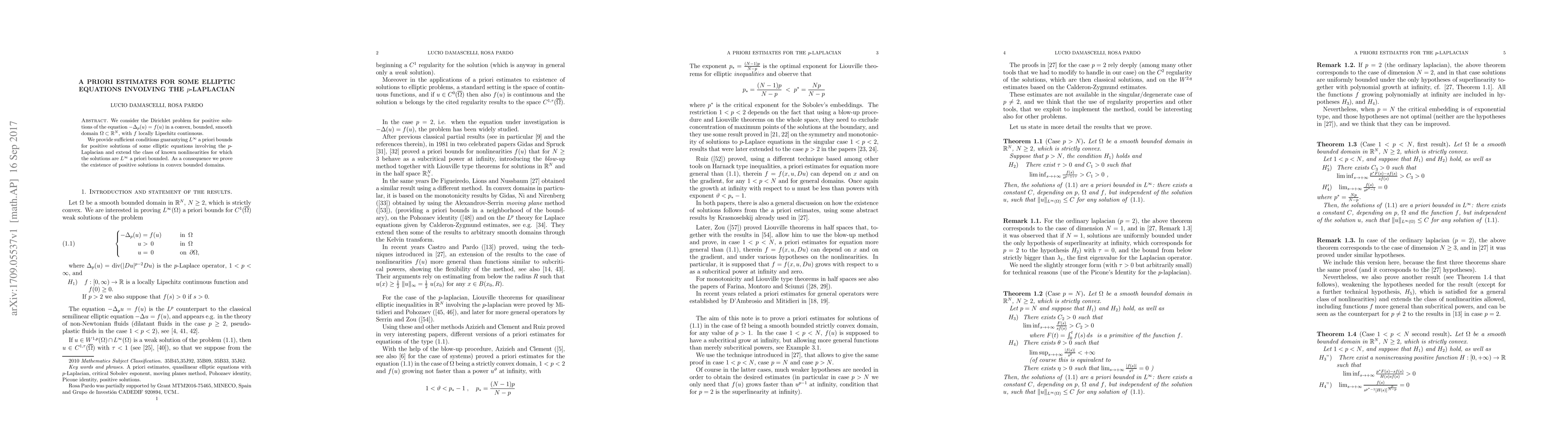 We consider the Dirichlet problem for positive solutions of the equation $-\Delta_p (u) = f(u)$ in a convex, bounded, smooth domain $\Omega \subset\R^N$, with $f$ locally Lipschitz continuous. \par We provide sufficient conditions guarantying $L^{\infty} $ a priori bounds for positive solutions of some elliptic equations involving the $p$-Laplacian and extend the class of known nonlinearities for which the solutions are $L^{\infty} $ a priori bounded. As a consequence we prove the existence of positive solutions in convex bounded domains.