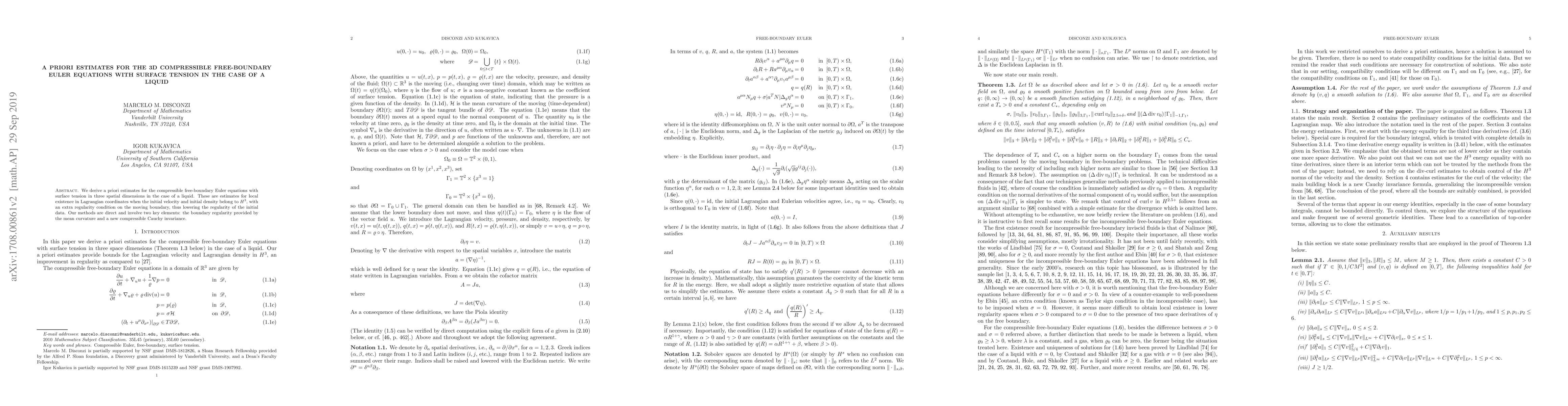 We derive a priori estimates for the compressible free-boundary Euler equations with surface tension in three spatial dimensions in the case of a liquid. These are estimates for local existence in Lagrangian coordinates when the initial velocity and initial density belong to $H^3$, with an extra regularity condition on the moving boundary, thus lowering the regularity of the initial data. Our methods are direct and involve two key elements: the boundary regularity provided by the mean curvature, and a new compressible Cauchy invariance.
