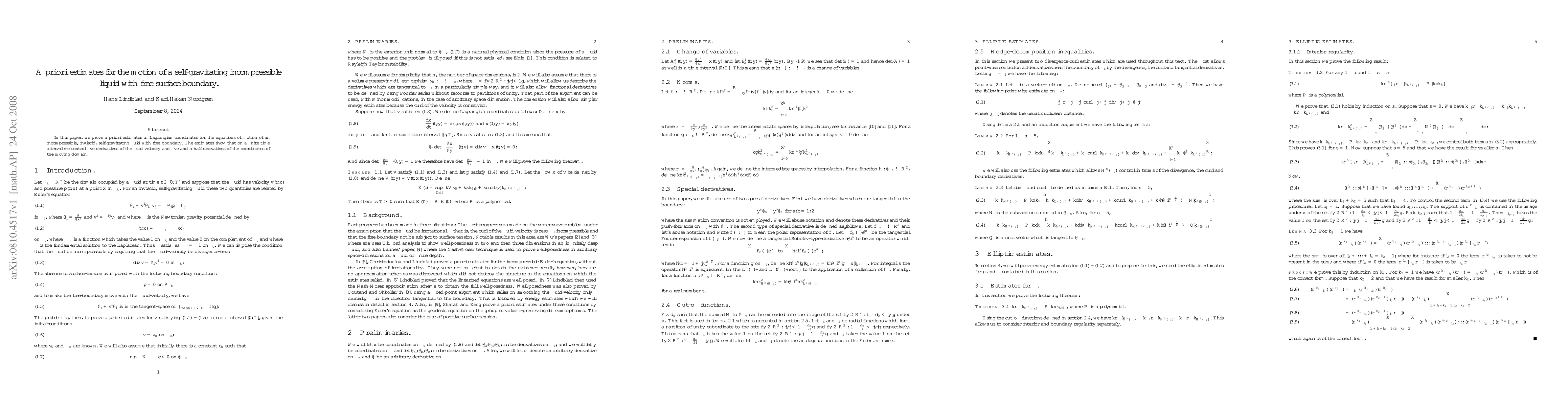 The paper presents a rigorous mathematical framework for estimating the regularity of solutions to the equations governing a self-gravitating incompressible fluid with a free surface, providing crucial a priori bounds.