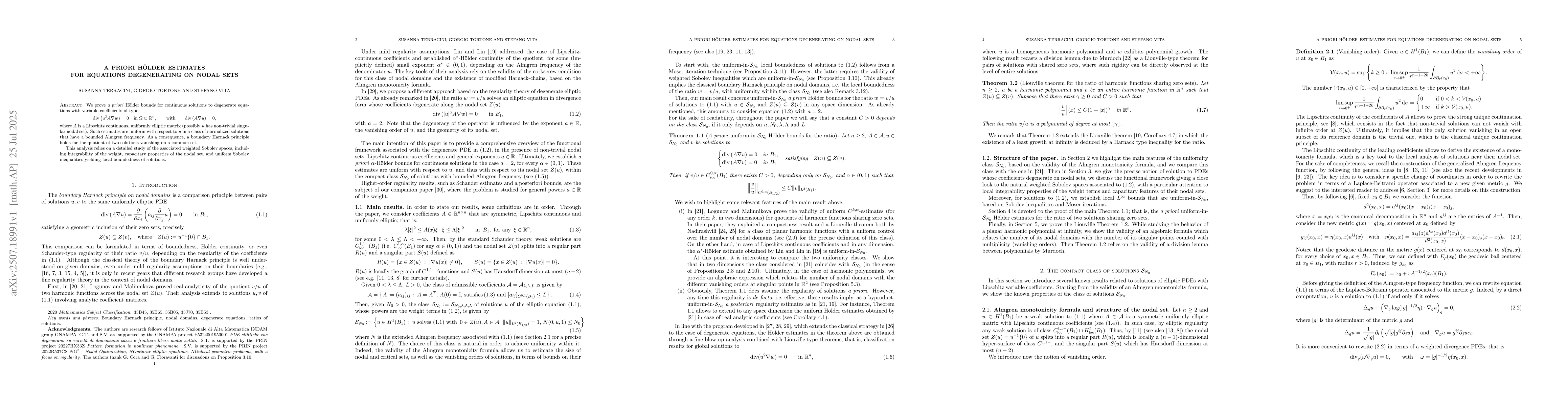We prove a priori H\"older bounds for continuous solutions to degenerate equations with variable coefficients of type $$ \mathrm{div}\left(u^2 A\nabla w\right)=0\quad\mathrm{in \ }\Omega\subset\mathbb R^n,\qquad \mbox{with}\qquad \mathrm{div}\left(A\nabla u\right)=0, $$ where $A$ is a Lipschitz continuous, uniformly elliptic matrix (possibly $u$ has non-trivial singular nodal set). Such estimates are uniform with respect to $u$ in a class of normalized solutions that have a bounded Almgren frequency. As a consequence, a boundary Harnack principle holds for the quotient of two solutions vanishing on a common set. This analysis relies on a detailed study of the associated weighted Sobolev spaces, including integrability of the weight, capacitary properties of the nodal set, and uniform Sobolev inequalities yielding local boundedness of solutions.