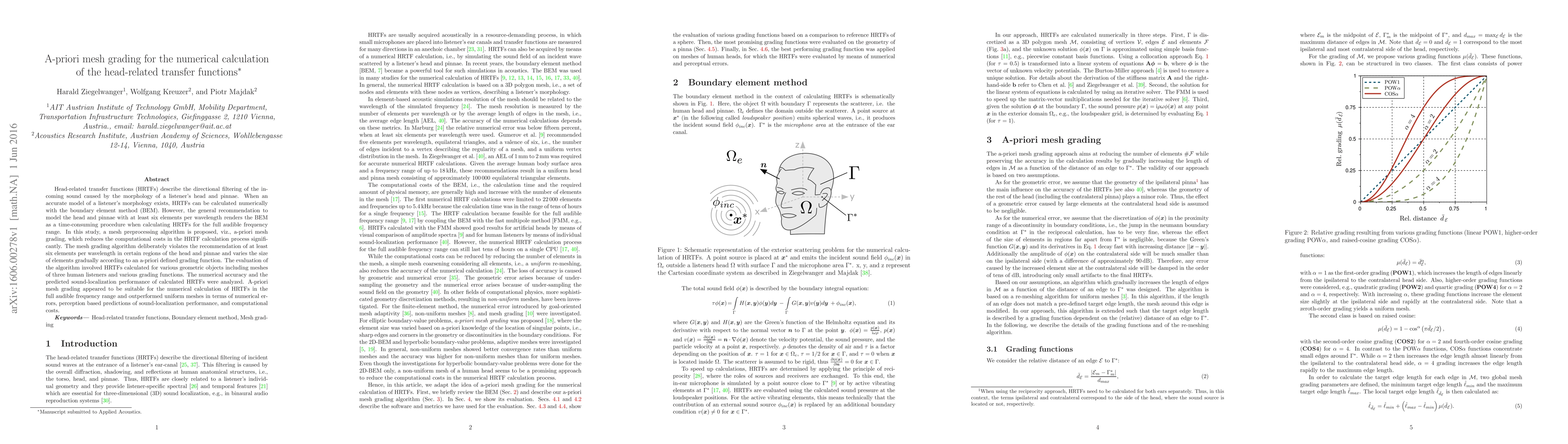 Head-related transfer functions (HRTFs) describe the directional filtering of the incoming sound caused by the morphology of a listener's head and pinnae. When an accurate model of a listener's morphology exists, HRTFs can be calculated numerically with the boundary element method (BEM). However, the general recommendation to model the head and pinnae with at least six elements per wavelength renders the BEM as a time-consuming procedure when calculating HRTFs for the full audible frequency range. In this study, a mesh preprocessing algorithm is proposed, viz., a-priori mesh grading, which reduces the computational costs in the HRTF calculation process significantly. The mesh grading algorithm deliberately violates the recommendation of at least six elements per wavelength in certain regions of the head and pinnae and varies the size of elements gradually according to an a-priori defined grading function. The evaluation of the algorithm involved HRTFs calculated for various geometric objects including meshes of three human listeners and various grading functions. The numerical accuracy and the predicted sound-localization performance of calculated HRTFs were analyzed. A-priori mesh grading appeared to be suitable for the numerical calculation of HRTFs in the full audible frequency range and outperformed uniform meshes in terms of numerical errors, perception based predictions of sound-localization performance, and computational costs.