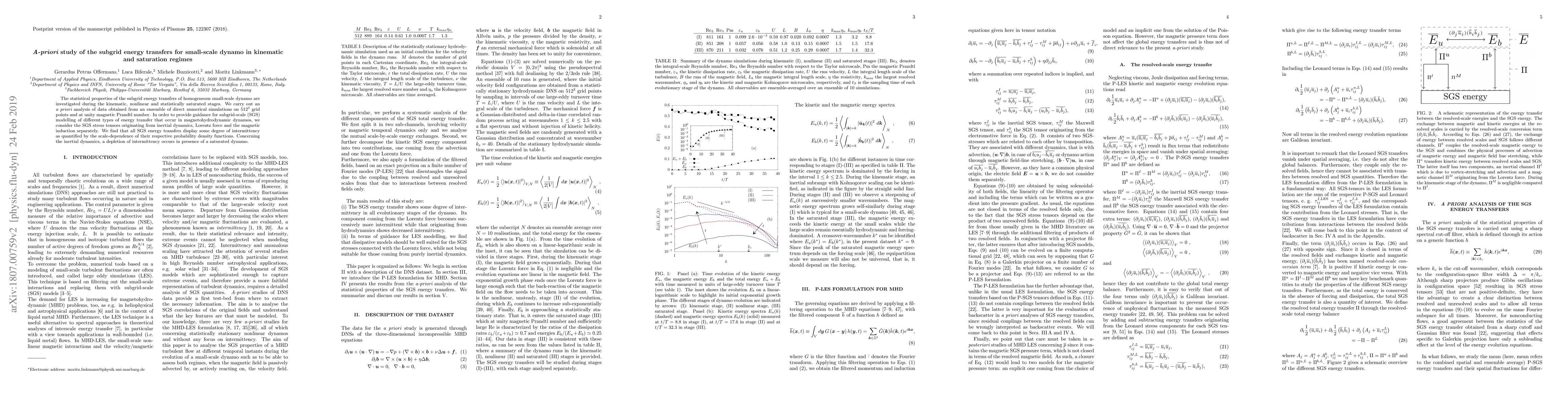 The statistical properties of the subgrid energy transfers of homogeneous small-scale dynamo are investigated during the kinematic, nonlinear and statistically saturated stages. We carry out an a priori analysis of data obtained from an ensemble of direct numerical simulations on $512^3$ grid points and at unity magnetic Prandtl number. In order to provide guidance for subgrid-scale (SGS) modelling of different types of energy transfer that occur in magnetohydrodynamic dynamos, we consider the SGS stress tensors originating from inertial dynamics, Lorentz force and the magnetic induction separately. We find that all SGS energy transfers display some degree of intermittency as quantified by the scale-dependence of their respective probability density functions. Concerning the inertial dynamics, a depletion of intermittency occurs in presence of a saturated dynamo.