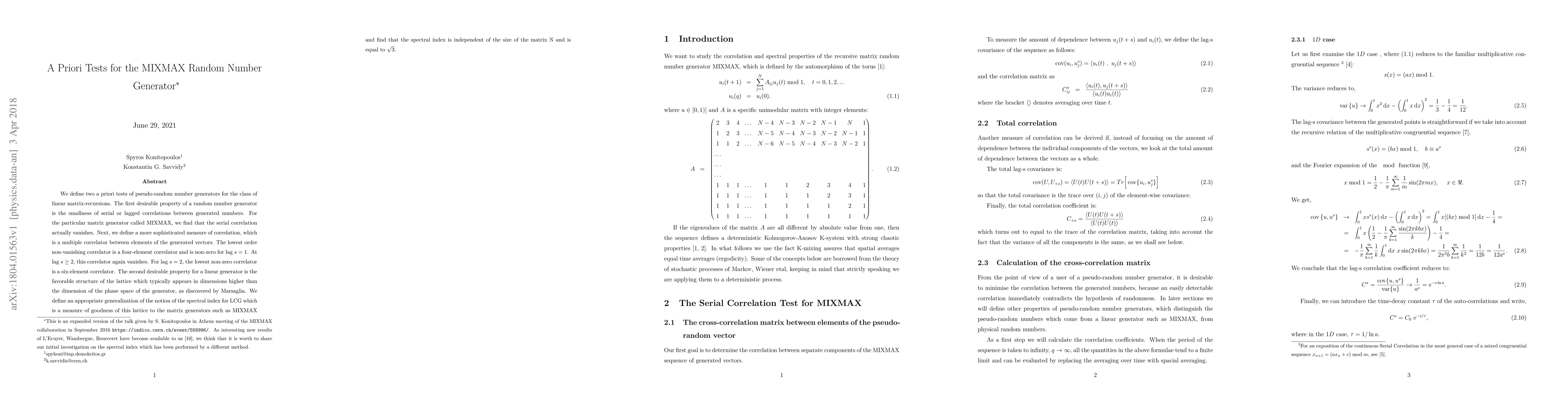 The paper defines two a priori tests for linear matrix-recursion pseudo-random number generators, specifically focusing on the MIXMAX generator. It examines serial correlation and lattice structure properties.