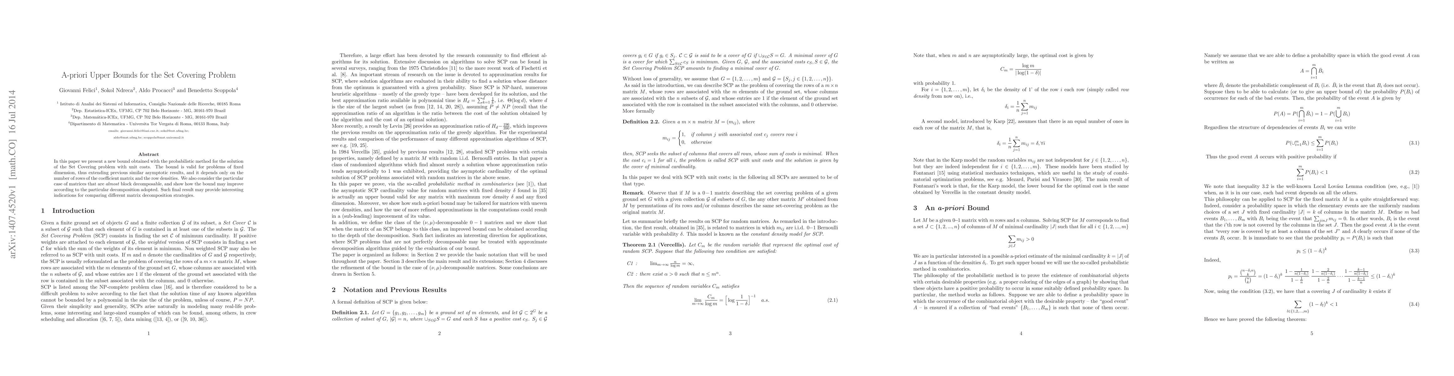 This paper presents a new bound for the Set Covering problem using the probabilistic method, which depends on the matrix dimension and row densities, offering a fixed-dimension extension of previous results.