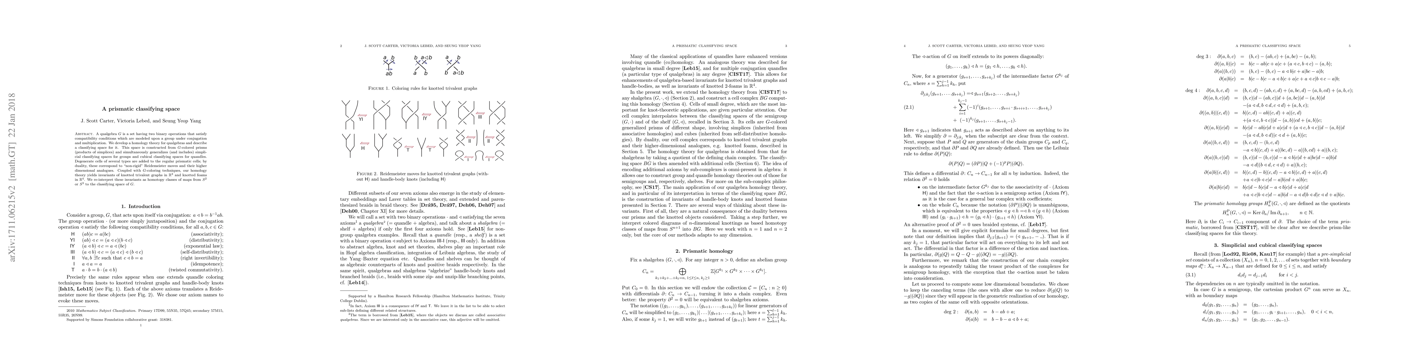 A qualgebra $G$ is a set having two binary operations that satisfy compatibility conditions which are modeled upon a group under conjugation and multiplication. We develop a homology theory for qualgebras and describe a classifying space for it. This space is constructed from $G$-colored prisms (products of simplices) and simultaneously generalizes (and includes) simplicial classifying spaces for groups and cubical classifying spaces for quandles. Degenerate cells of several types are added to the regular prismatic cells; by duality, these correspond to "non-rigid" Reidemeister moves and their higher dimensional analogues. Coupled with $G$-coloring techniques, our homology theory yields invariants of knotted trivalent graphs in $\mathbb{R}^3$ and knotted foams in $\mathbb{R}^4$. We re-interpret these invariants as homotopy classes of maps from $S^2$ or $S^3$ to the classifying space of $G$.