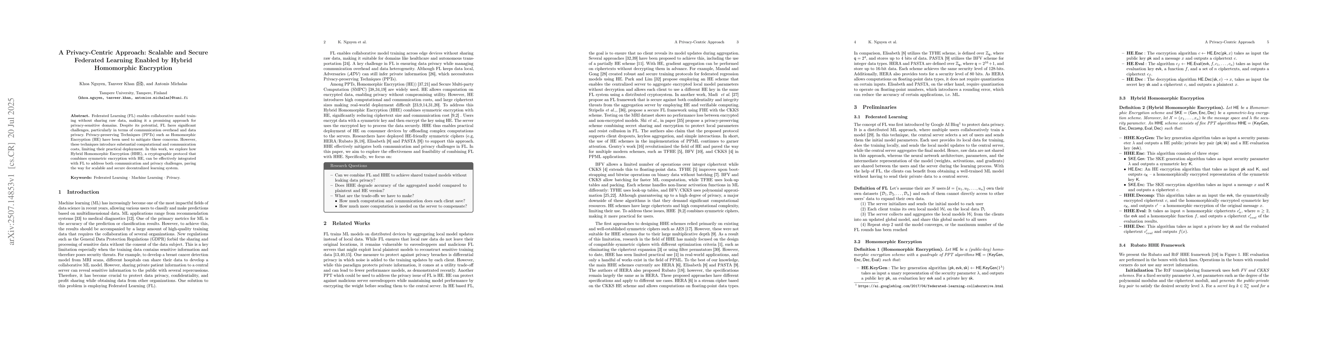 Federated Learning (FL) enables collaborative model training without sharing raw data, making it a promising approach for privacy-sensitive domains. Despite its potential, FL faces significant challenges, particularly in terms of communication overhead and data privacy. Privacy-preserving Techniques (PPTs) such as Homomorphic Encryption (HE) have been used to mitigate these concerns. However, these techniques introduce substantial computational and communication costs, limiting their practical deployment. In this work, we explore how Hybrid Homomorphic Encryption (HHE), a cryptographic protocol that combines symmetric encryption with HE, can be effectively integrated with FL to address both communication and privacy challenges, paving the way for scalable and secure decentralized learning system.