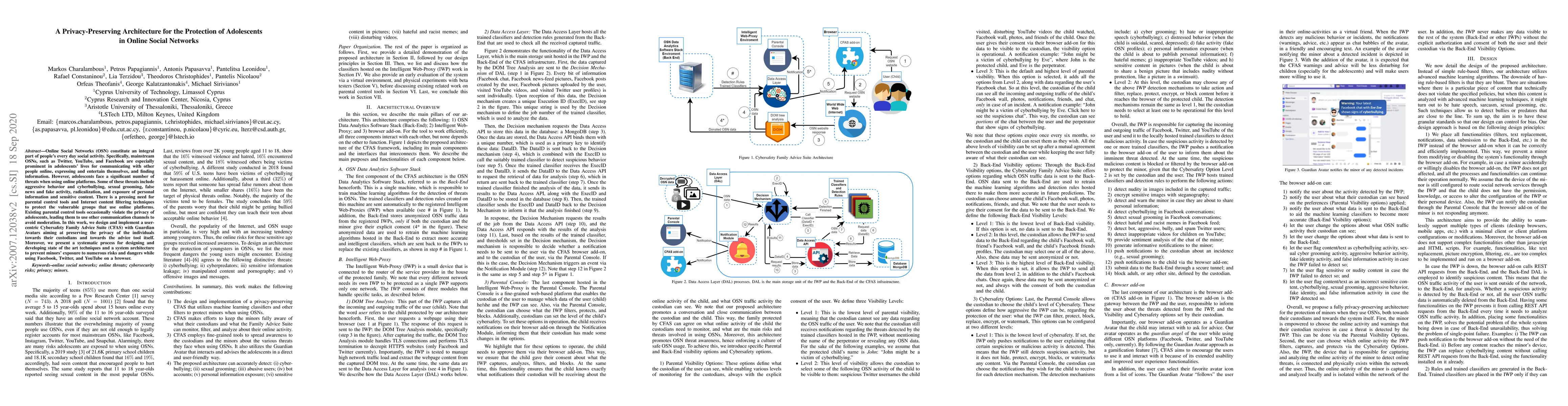 This paper proposes a privacy-preserving architecture called the Family Advice Suite with Guardian Avatars to protect adolescents on online social networks like Facebook, Twitter, and YouTube. The system aims to safeguard minors from threats such as cyberbullying and exposure to harmful content while ensuring their privacy is respected.