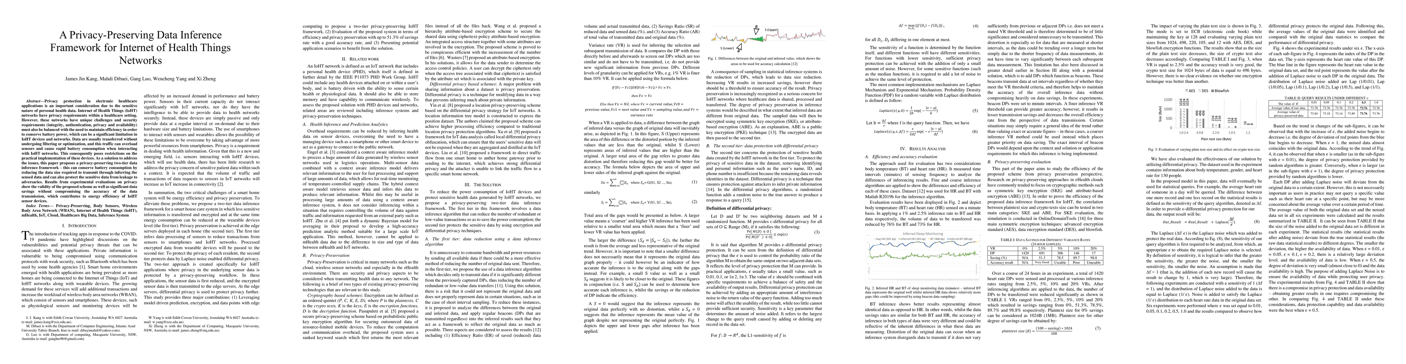 Privacy protection in electronic healthcare applications is an important consideration due to the sensitive nature of personal health data. Internet of Health Things (IoHT) networks have privacy requirements within a healthcare setting. However, these networks have unique challenges and security requirements (integrity, authentication, privacy and availability) must also be balanced with the need to maintain efficiency in order to conserve battery power, which can be a significant limitation in IoHT devices and networks. Data are usually transferred without undergoing filtering or optimization, and this traffic can overload sensors and cause rapid battery consumption when interacting with IoHT networks. This consequently poses restrictions on the practical implementation of these devices. As a solution to address the issues, this paper proposes a privacy-preserving two-tier data inference framework, this can conserve battery consumption by reducing the data size required to transmit through inferring the sensed data and can also protect the sensitive data from leakage to adversaries. Results from experimental evaluations on privacy show the validity of the proposed scheme as well as significant data savings without compromising the accuracy of the data transmission, which contributes to energy efficiency of IoHT sensor devices.