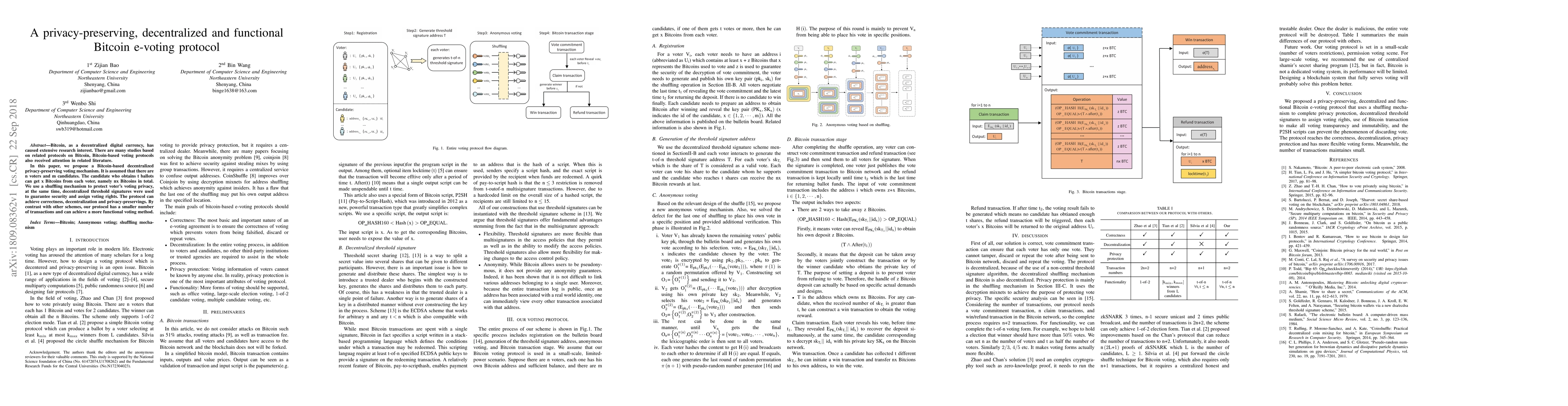 This paper proposes a privacy-preserving, decentralized Bitcoin-based e-voting protocol that uses a shuffling mechanism and decentralized threshold signatures to protect voter privacy and ensure security. The protocol achieves correctness, decentralization, and privacy while requiring fewer transactions compared to other schemes.