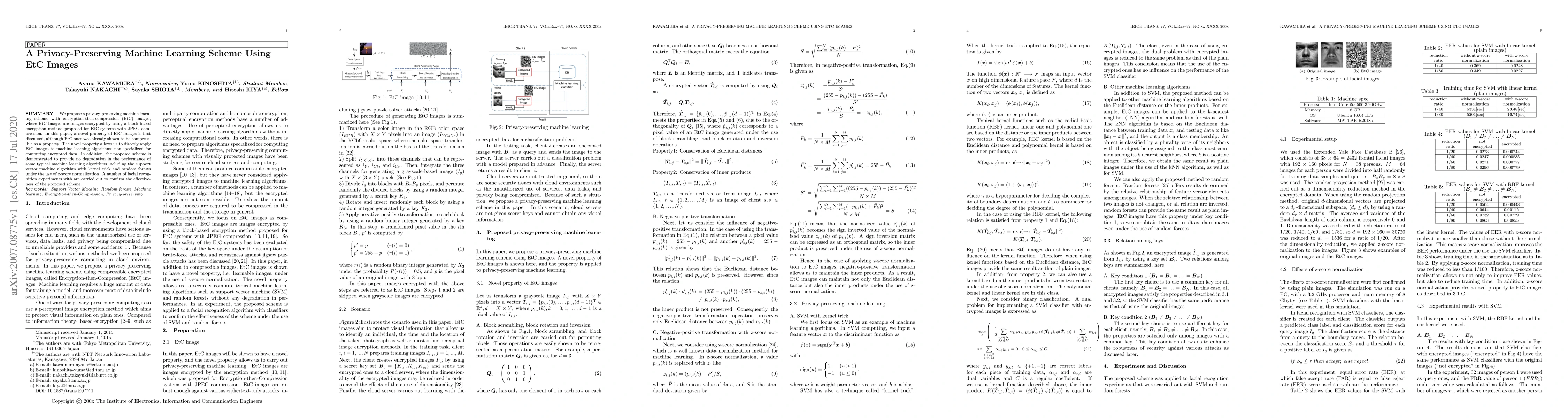 This paper introduces a privacy-preserving machine learning scheme using encryption-then-compression (EtC) images, which allows direct application to non-specialized machine learning algorithms without performance degradation. Experiments confirm the effectiveness of the scheme in facial recognition tasks.