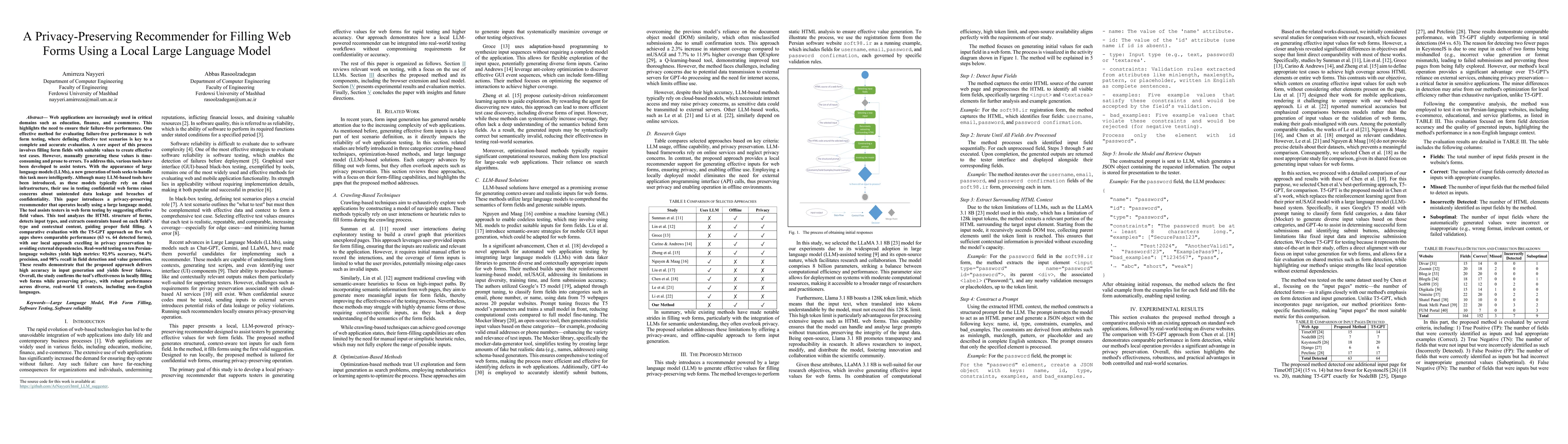 Web applications are increasingly used in critical domains such as education, finance, and e-commerce. This highlights the need to ensure their failure-free performance. One effective method for evaluating failure-free performance is web form testing, where defining effective test scenarios is key to a complete and accurate evaluation. A core aspect of this process involves filling form fields with suitable values to create effective test cases. However, manually generating these values is time-consuming and prone to errors. To address this, various tools have been developed to assist testers. With the appearance of large language models (LLMs), a new generation of tools seeks to handle this task more intelligently. Although many LLM-based tools have been introduced, as these models typically rely on cloud infrastructure, their use in testing confidential web forms raises concerns about unintended data leakage and breaches of confidentiality. This paper introduces a privacy-preserving recommender that operates locally using a large language model. The tool assists testers in web form testing by suggesting effective field values. This tool analyzes the HTML structure of forms, detects input types, and extracts constraints based on each field's type and contextual content, guiding proper field filling.