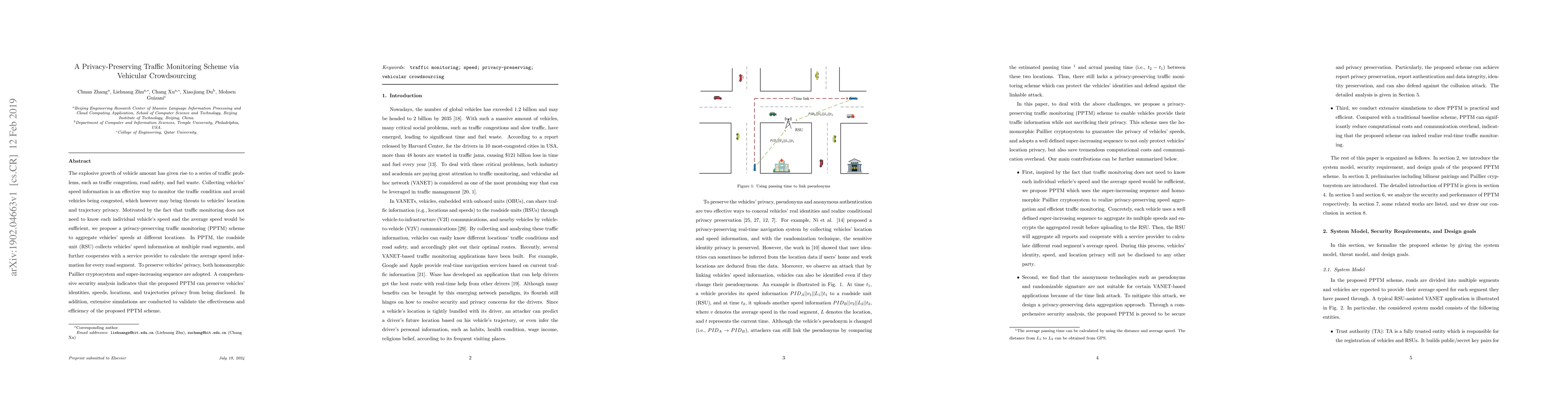 A new traffic monitoring scheme uses crowdsourced speed data to track traffic conditions while preserving vehicle location and trajectory privacy through cryptography. The scheme's effectiveness and efficiency have been validated through simulations.