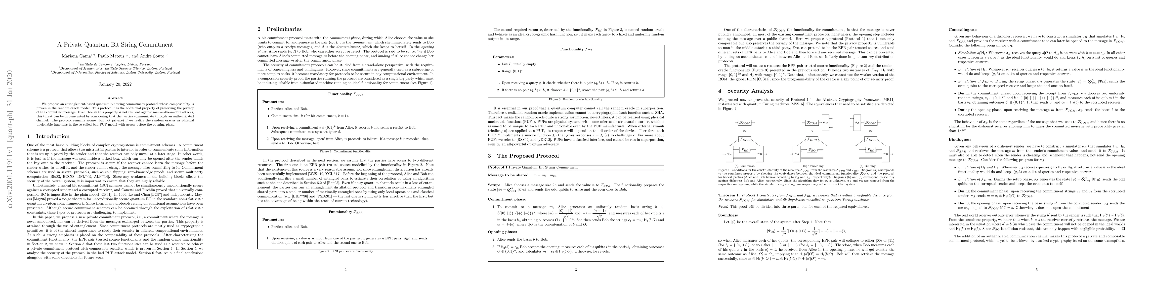 This paper proposes an entanglement-based quantum bit string commitment protocol that is composable and preserves message privacy, though not against man-in-the-middle attacks unless using an authenticated channel. The protocol's security is maintained when random oracles are replaced by physical unclonable functions in the bad PUF model.