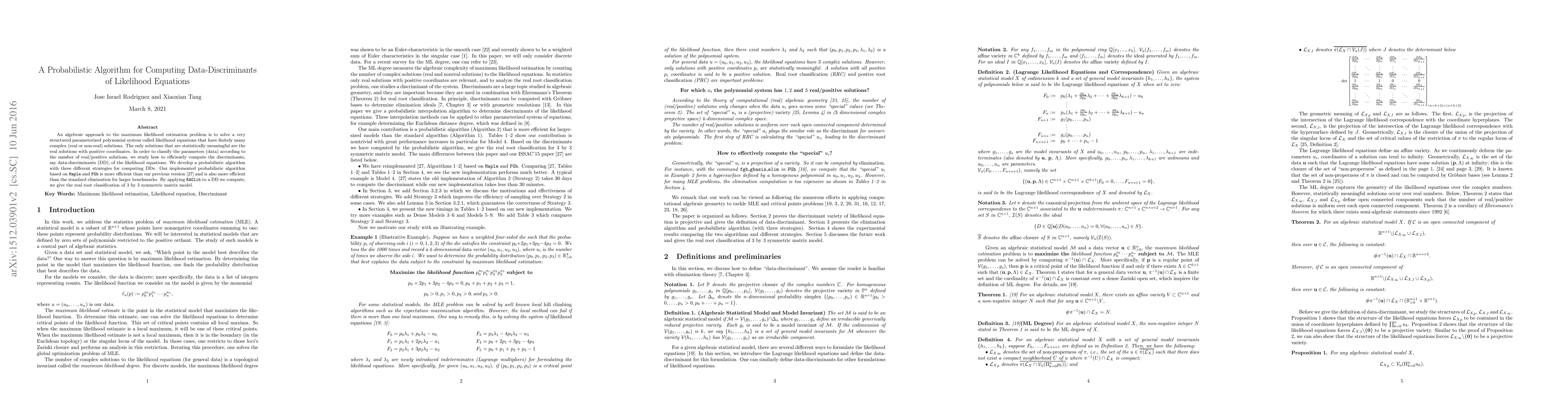 This paper presents a probabilistic algorithm for computing data-discriminants (DD) of likelihood equations, which classify parameters based on the number of real/positive solutions. The new algorithm is more efficient than previous versions and standard elimination methods, demonstrated through its application to a 3 by 3 symmetric matrix model.