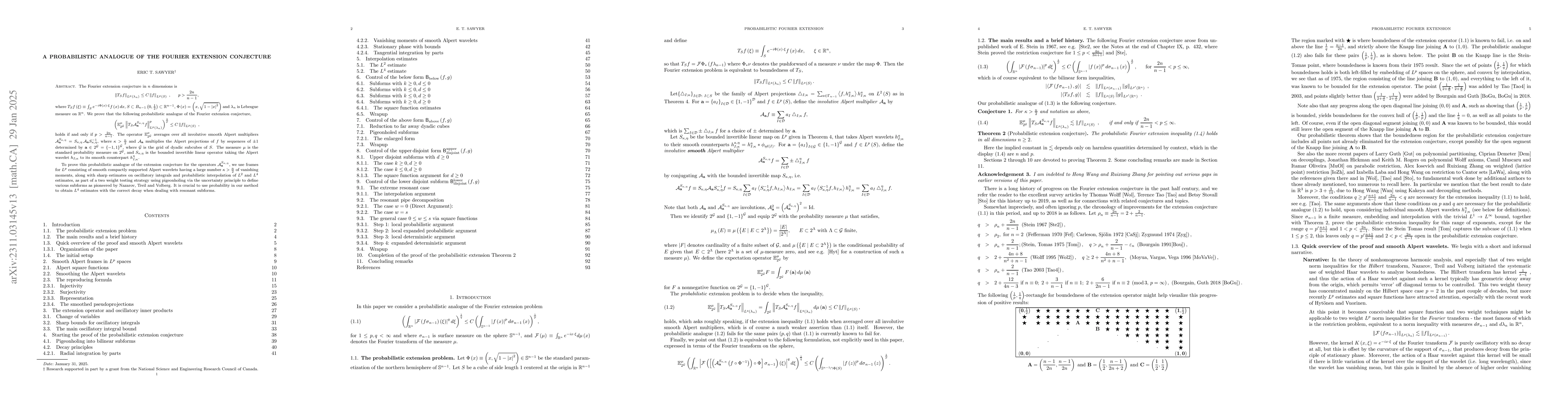 This paper establishes a probabilistic analogue of the Fourier extension theorem and leverages it to prove the Kakeya conjecture, utilizing smooth Alpert wavelets and classical techniques like stationary phase and interpolation for L^2 and L^4 estimates. The key innovation lies in averaging over Alpert multipliers to achieve the necessary L^4 bounds.