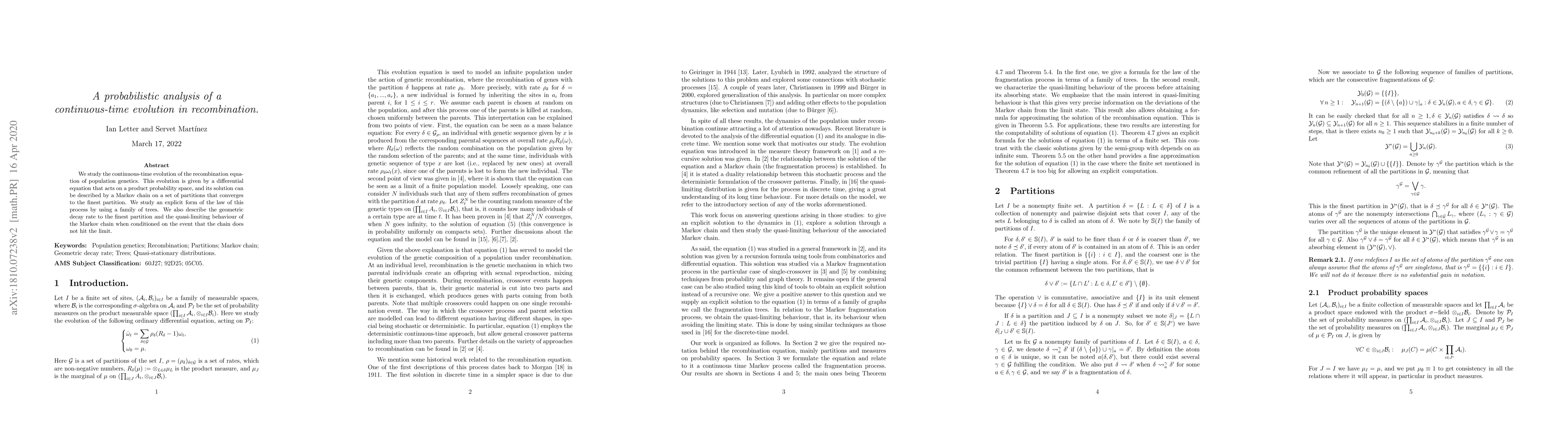 Researchers study the continuous evolution of population genetics recombination, finding a geometric decay rate to its finest partition and quasi-stationary behavior in certain conditions.