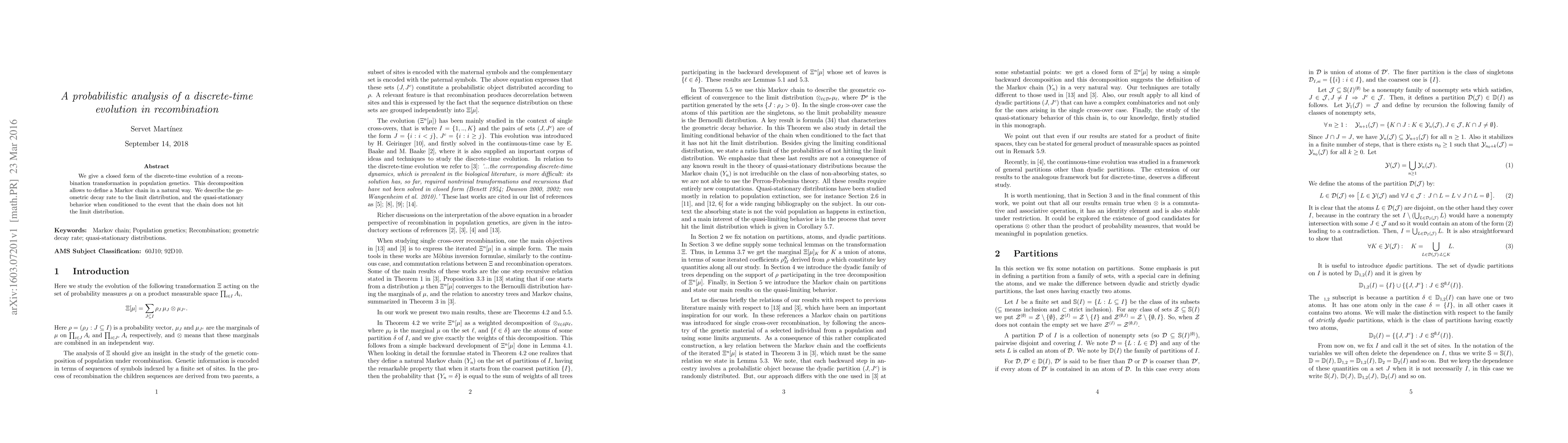 Researchers developed a closed-form solution for the discrete-time evolution of recombination in population genetics, allowing for a Markov chain model that can capture geometric decay rates to a limit distribution and quasi-stationary behavior.