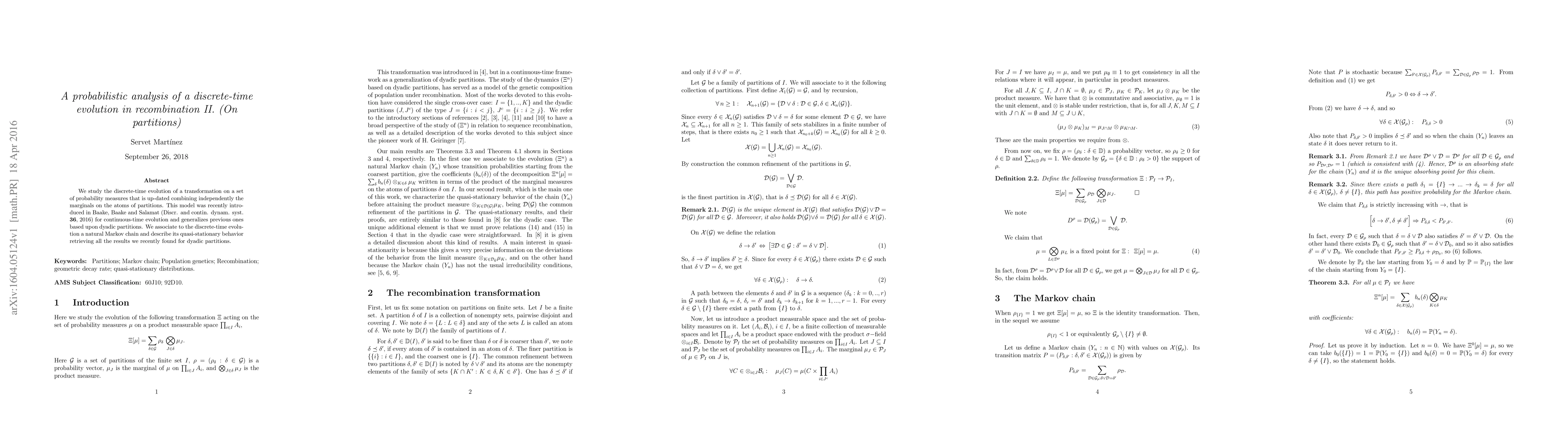 Researchers analyzed a discrete-time evolution model for transformation on probability measures, finding quasi-stationary behavior that generalizes previous results for dyadic partitions.