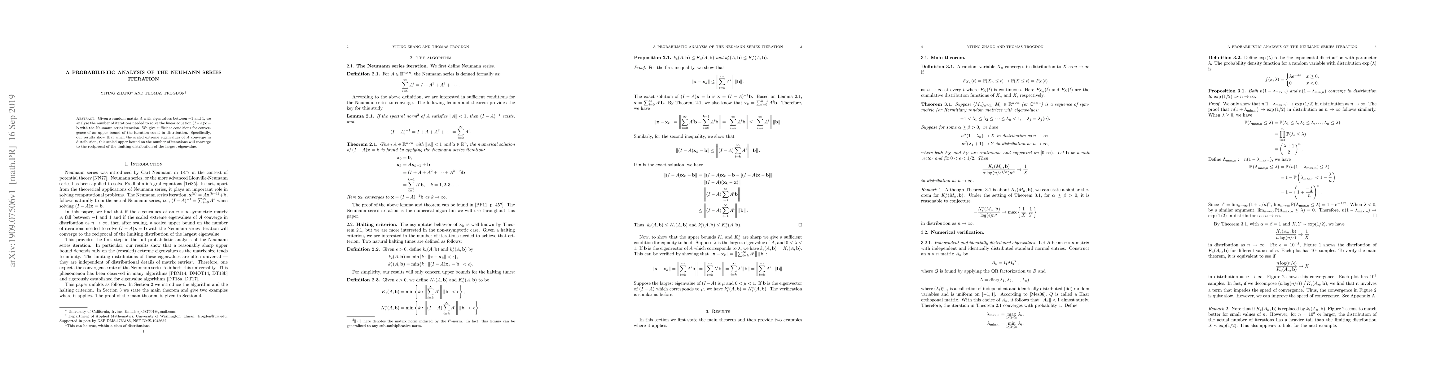 This research paper analyzes the number of iterations needed to solve a linear equation using the Neumann series iteration for random matrices with eigenvalues between -1 and 1. The study finds that when certain conditions are met, the number of iterations converges to the reciprocal of the limiting distribution of the largest eigenvalue.