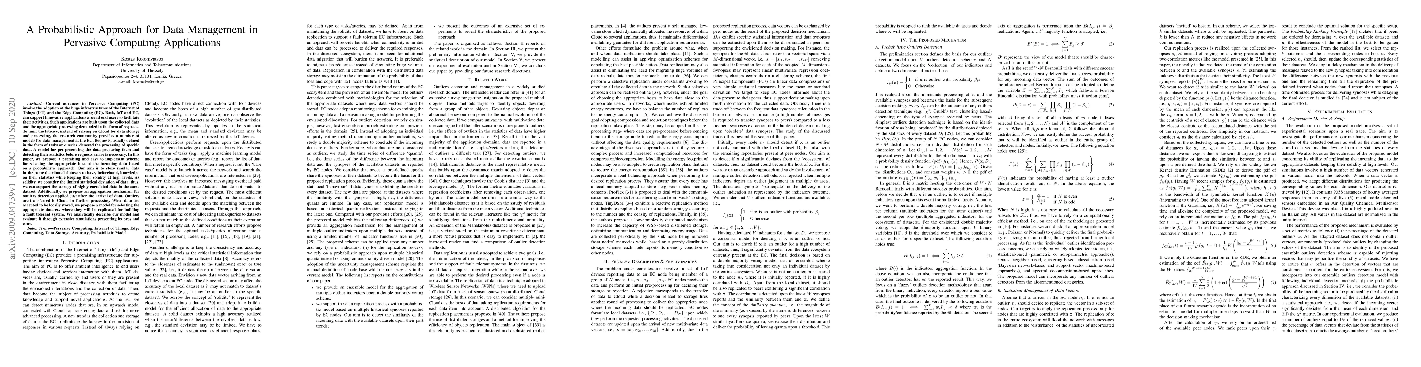 The paper proposes a probabilistic approach for data management in pervasive computing applications, focusing on edge computing (EC) nodes. It involves pre-processing data, detecting their statistics, and employing a probabilistic model for selecting the appropriate host for incoming data based on similarity and statistical deviation. The model also includes an outlier detection mechanism for transferring outliers to the cloud and a replication model for fault-tolerant systems.