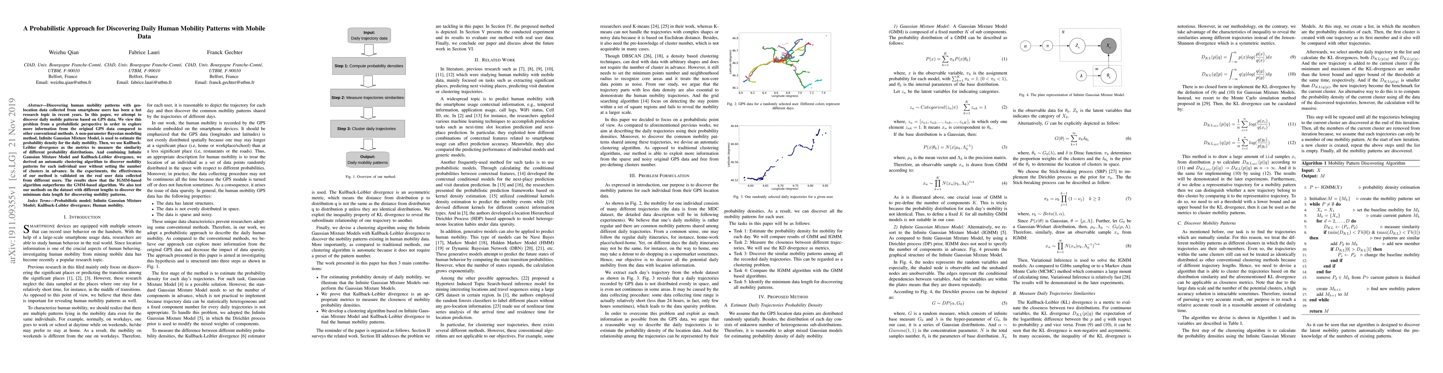 This paper proposes a probabilistic approach using Infinite Gaussian Mixture Models and Kullback-Leibler divergence to automatically discover daily human mobility patterns from GPS data, outperforming traditional GMM-based methods. The method is validated on real user data and determines the minimum data length required for effective pattern discovery.