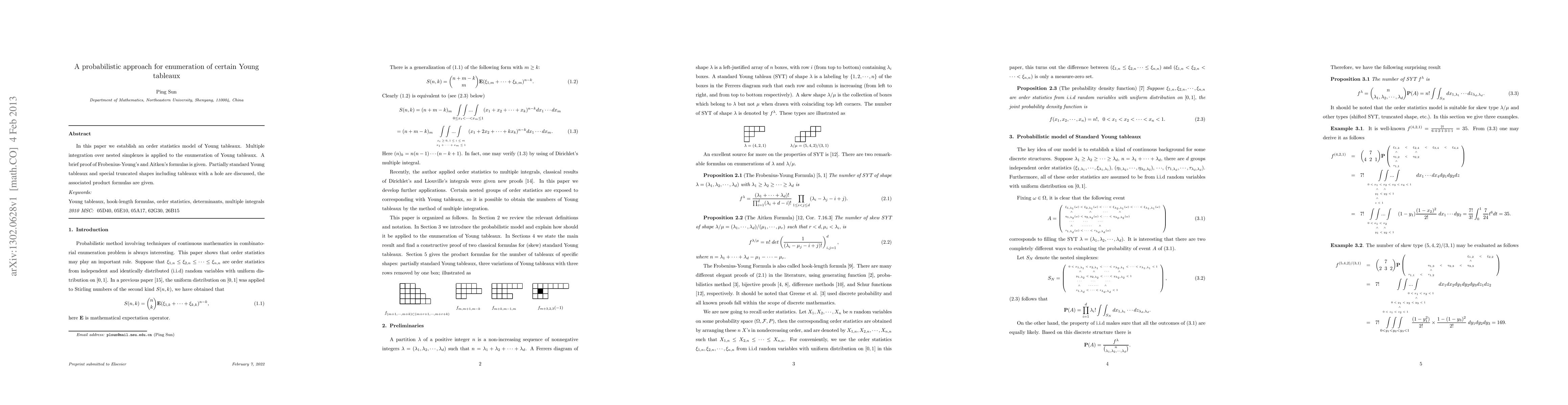 This paper develops a probabilistic model for enumerating Young tableaux using order statistics and multiple integration over nested simplexes. It also provides proofs for Frobenius-Young's and Aitken's formulas and discusses partially standard tableaux and special truncated shapes, including those with holes.