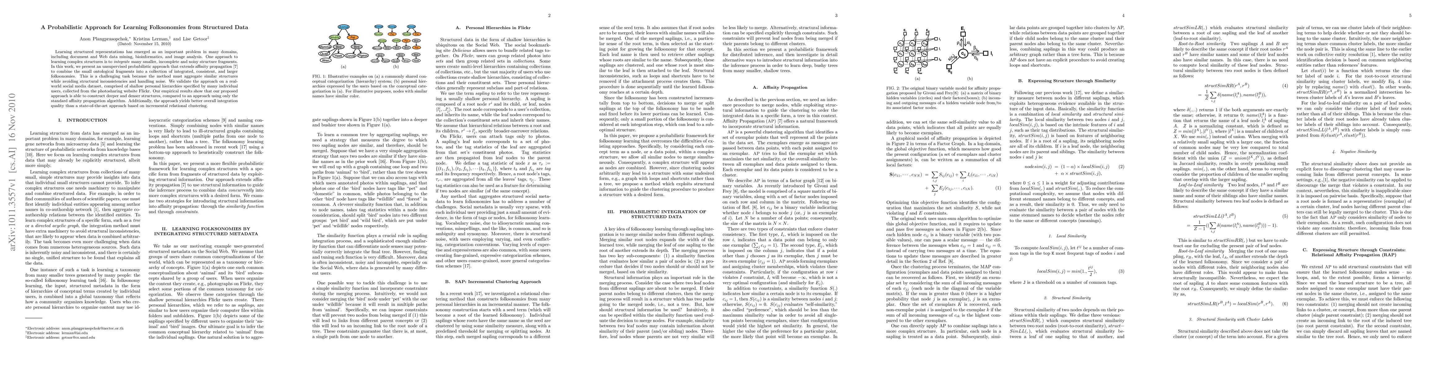 Learning structured representations has emerged as an important problem in many domains, including document and Web data mining, bioinformatics, and image analysis. One approach to learning complex structures is to integrate many smaller, incomplete and noisy structure fragments. In this work, we present an unsupervised probabilistic approach that extends affinity propagation to combine the small ontological fragments into a collection of integrated, consistent, and larger folksonomies. This is a challenging task because the method must aggregate similar structures while avoiding structural inconsistencies and handling noise. We validate the approach on a real-world social media dataset, comprised of shallow personal hierarchies specified by many individual users, collected from the photosharing website Flickr. Our empirical results show that our proposed approach is able to construct deeper and denser structures, compared to an approach using only the standard affinity propagation algorithm. Additionally, the approach yields better overall integration quality than a state-of-the-art approach based on incremental relational clustering.