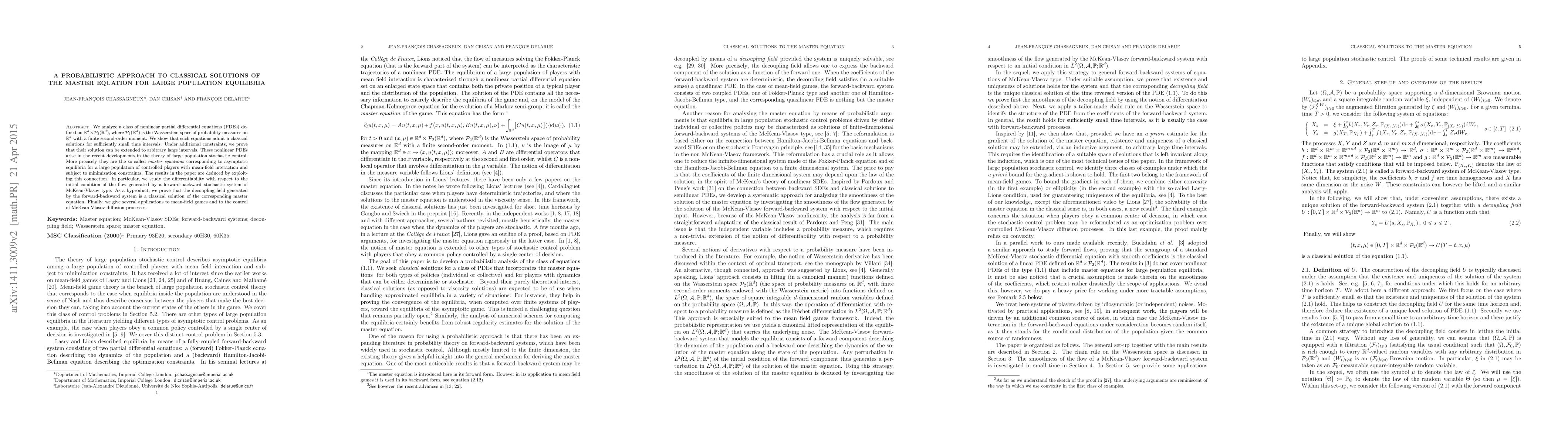 We analyze a class of nonlinear partial differential equations (PDEs) defined on $\mathbb{R}^d \times \mathcal{P}_2(\mathbb{R}^d),$ where $\mathcal{P}_2(\mathbb{R}^d)$ is the Wasserstein space of probability measures on $\mathbb{R}^d$ with a finite second-order moment. We show that such equations admit a classical solutions for sufficiently small time intervals. Under additional constraints, we prove that their solution can be extended to arbitrary large intervals. These nonlinear PDEs arise in the recent developments in the theory of large population stochastic control. More precisely they are the so-called master equations corresponding to asymptotic equilibria for a large population of controlled players with mean-field interaction and subject to minimization constraints. The results in the paper are deduced by exploiting this connection. In particular, we study the differentiability with respect to the initial condition of the flow generated by a forward-backward stochastic system of McKean-Vlasov type. As a byproduct, we prove that the decoupling field generated by the forward-backward system is a classical solution of the corresponding master equation. Finally, we give several applications to mean-field games and to the control of McKean-Vlasov diffusion processes.