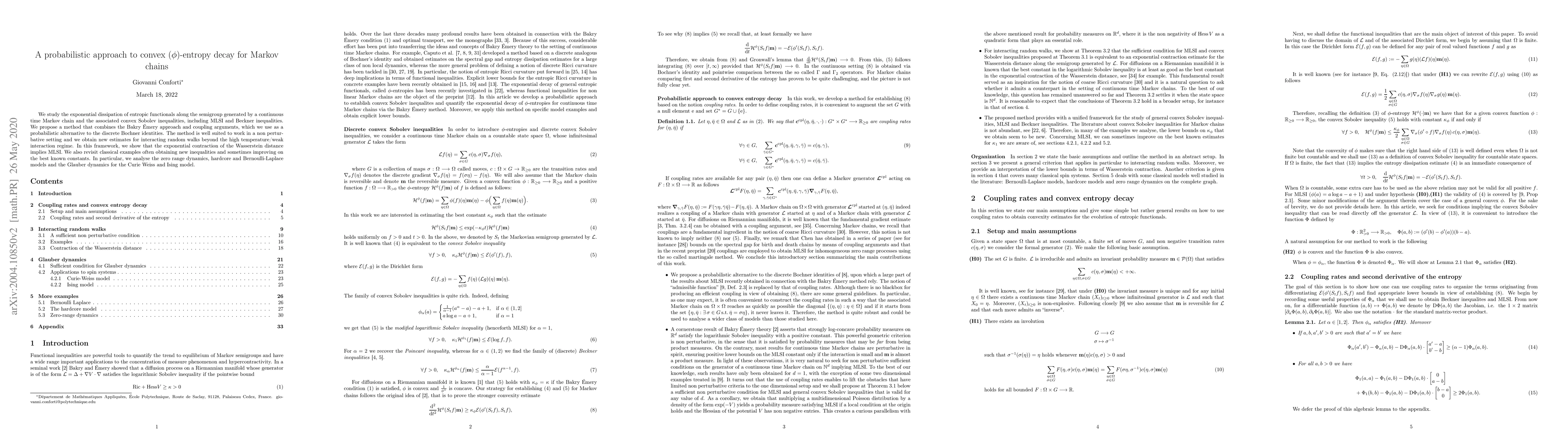 We study the exponential dissipation of entropic functionals for continuous time Markov chains and the associated convex Sobolev inequalities, including MLSI and Beckner inequalities. We propose a method that combines the Bakry \'Emery approach and coupling arguments, which we use as a probabilistic alternative to the discrete Bochner identities. The method is well suited to work in a non perturbative setting and we obtain new estimates for interacting random walks beyond the high temperature/weak interaction regime. In this framework, we also show that the exponential contraction of the Wasserstein distance along the semigroup implies MLSI. We also revisit classical examples often obtaining new inequalities and sometimes improving on the best known constants. In particular, we analyse the zero range dynamics, hardcore and Bernoulli-Laplace models and the Glauber dynamics for the Curie Weiss and Ising model.