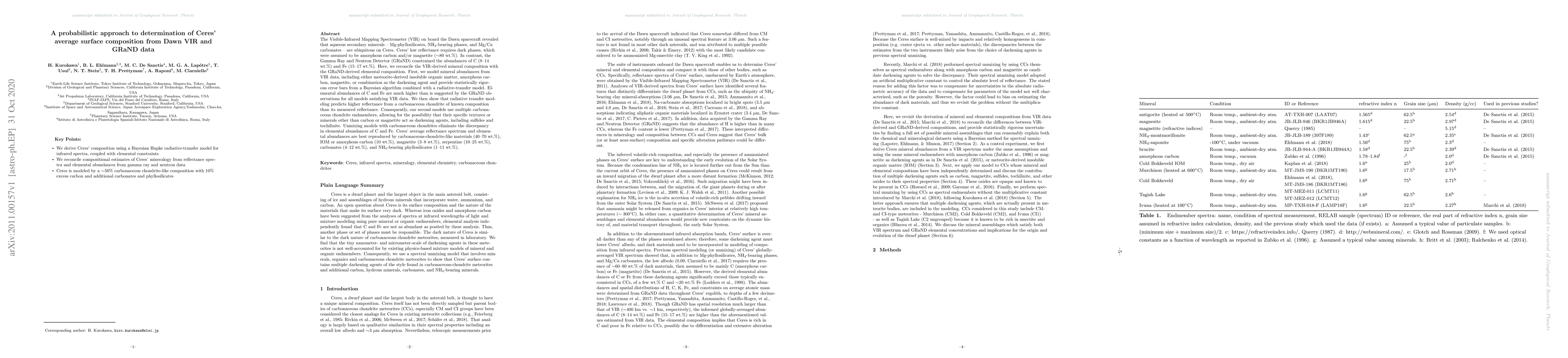 This paper uses Dawn spacecraft data to determine Ceres' average surface composition, reconciling mineral and elemental abundances from VIR and GRaND. The study finds that carbonaceous chondrite-like materials best match Ceres' reflectance and elemental composition, resolving discrepancies in carbon and iron abundances.
