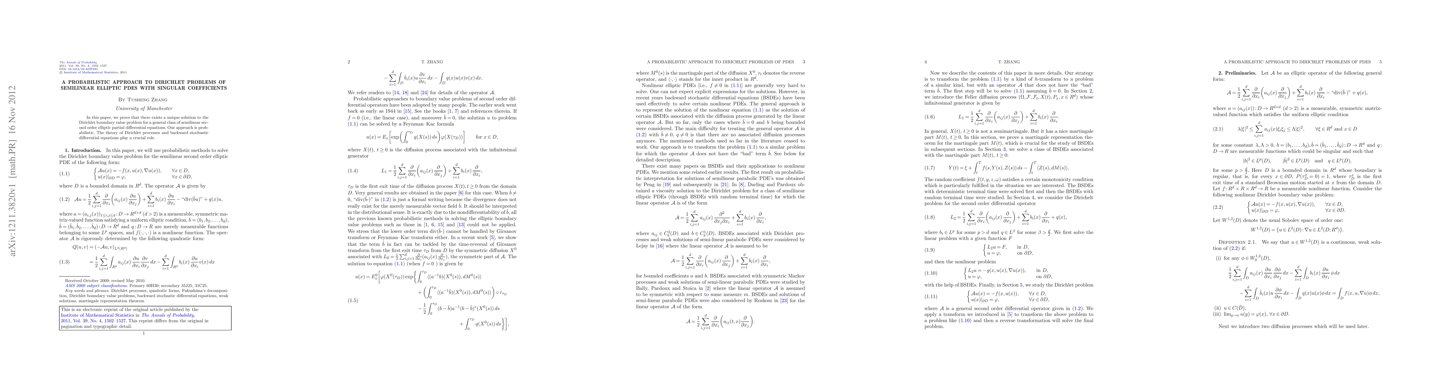 This paper proves the existence and uniqueness of a solution to Dirichlet boundary value problems for semilinear elliptic PDEs using a probabilistic approach, leveraging the theory of Dirichlet processes and backward stochastic differential equations.