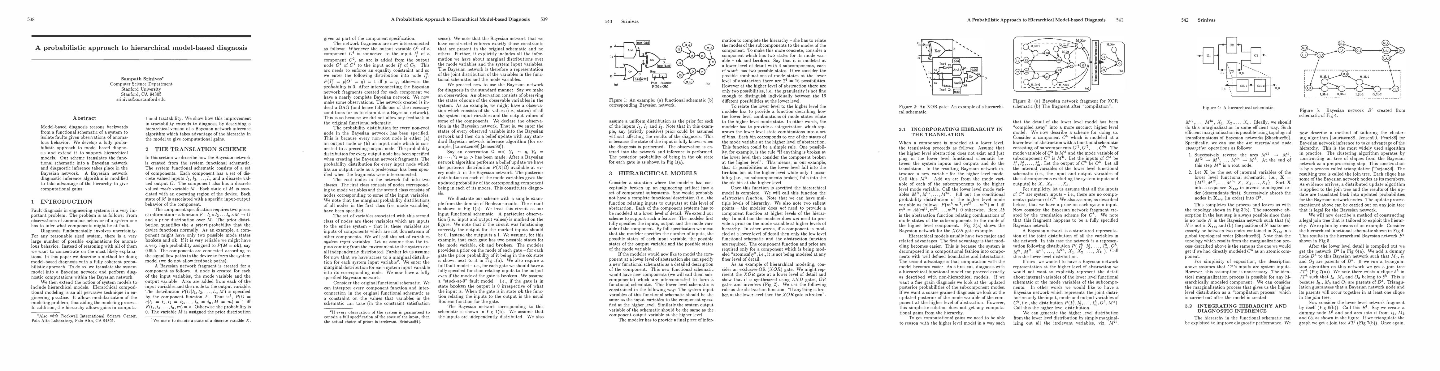 This paper proposes a probabilistic approach to model-based diagnosis using Bayesian networks, extending it to support hierarchical models for improved computational efficiency. The method translates system schematics into Bayesian networks and modifies the diagnostic inference algorithm to leverage the hierarchy.