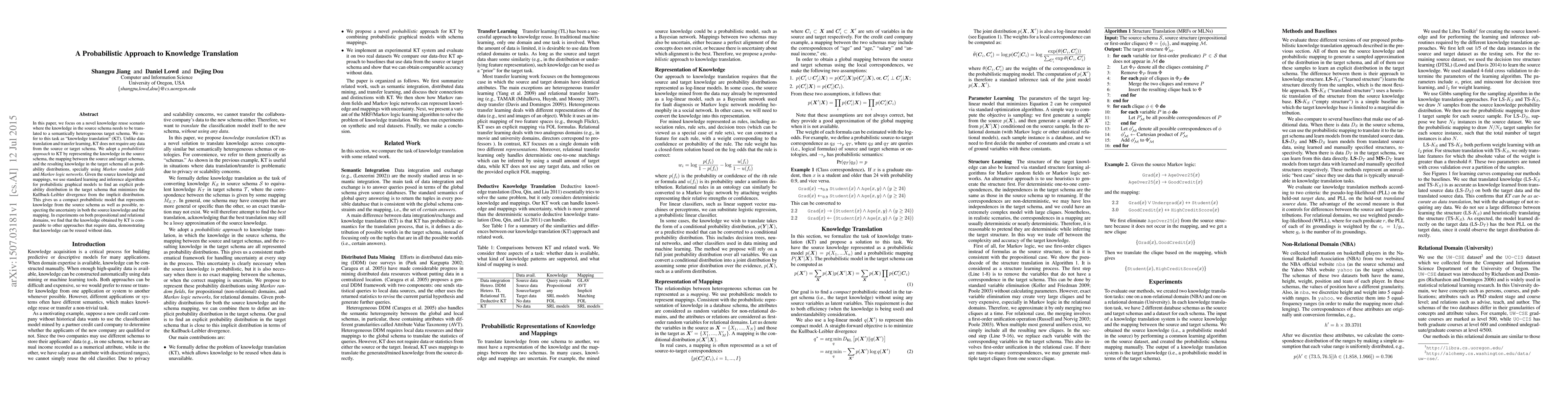This research introduces 'knowledge translation' (KT), a method to transfer knowledge between heterogeneous schemas using probability distributions. It employs Markov random fields and Markov logic networks, demonstrating that data-free knowledge reuse is possible and comparable to data-dependent approaches in experiments across propositional and relational domains.