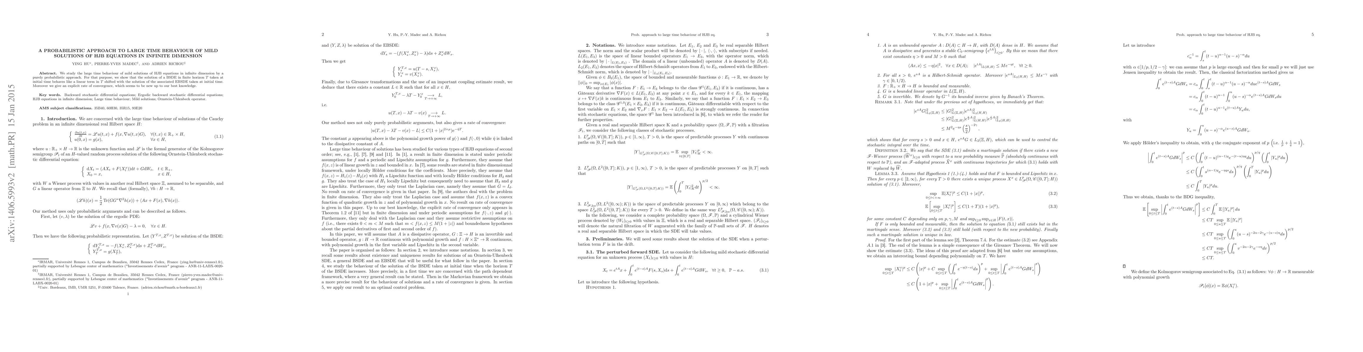 This research explores the large time behavior of solutions to Hamilton-Jacobi-Bellman (HJB) equations in infinite dimensions using a probabilistic method. It reveals that the solution of a Backward Stochastic Differential Equation (BSDE) at initial time scales linearly with time T, influenced by the solution of the associated Extended Backward Stochastic Differential Equation (EBSDE) at the same time. The paper also provides an explicit rate of convergence, a detail seldom found in existing literature.