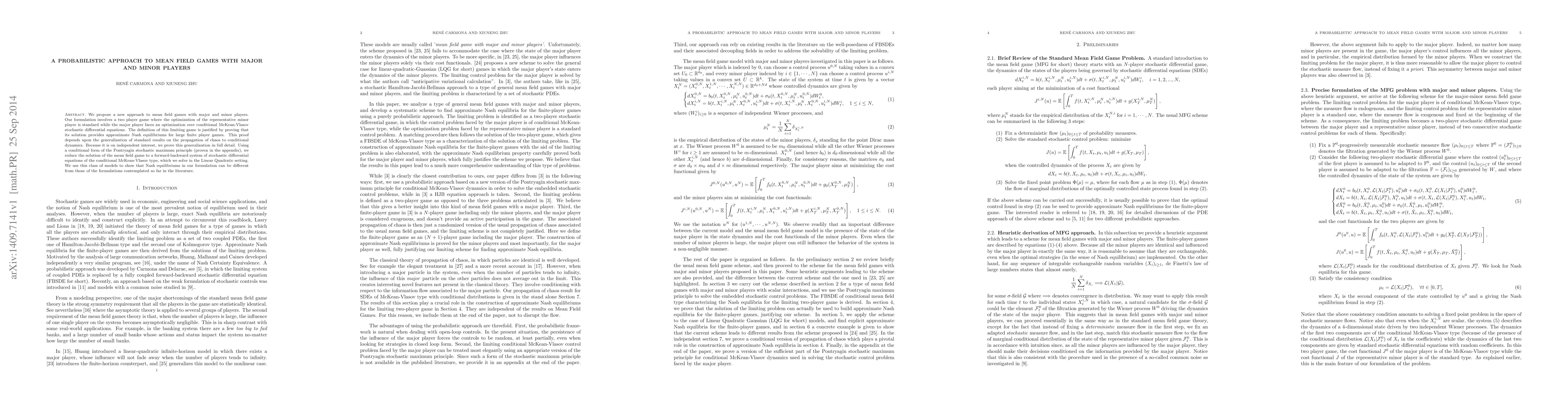 This paper introduces a probabilistic approach to mean field games involving major and minor players, where the major player optimizes over conditional McKean-Vlasov stochastic differential equations. The authors prove that the proposed limiting game solution approximates Nash equilibriums for large finite player games, using a conditional form of the Pontryagin maximum principle.