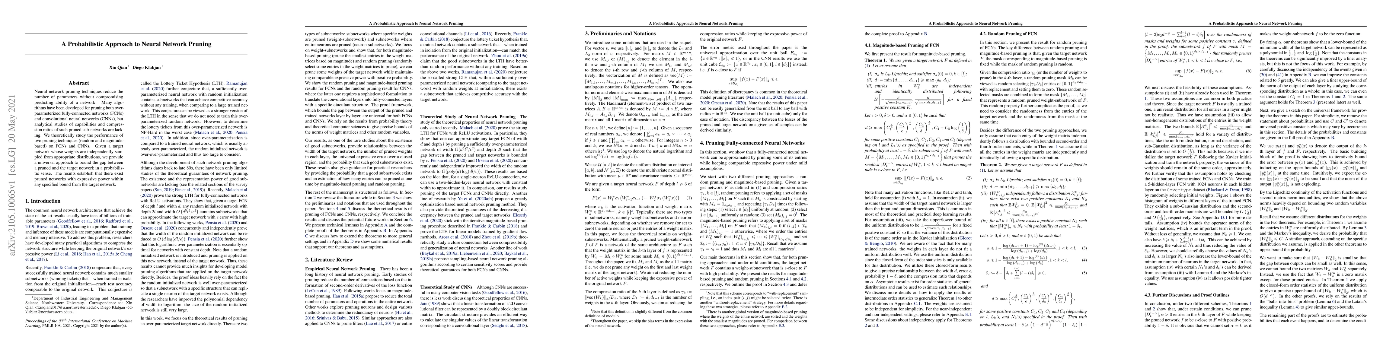 Neural network pruning techniques reduce the number of parameters without compromising predicting ability of a network. Many algorithms have been developed for pruning both over-parameterized fully-connected networks (FCNs) and convolutional neural networks (CNNs), but analytical studies of capabilities and compression ratios of such pruned sub-networks are lacking. We theoretically study the performance of two pruning techniques (random and magnitude-based) on FCNs and CNNs. Given a target network {whose weights are independently sampled from appropriate distributions}, we provide a universal approach to bound the gap between a pruned and the target network in a probabilistic sense. The results establish that there exist pruned networks with expressive power within any specified bound from the target network.