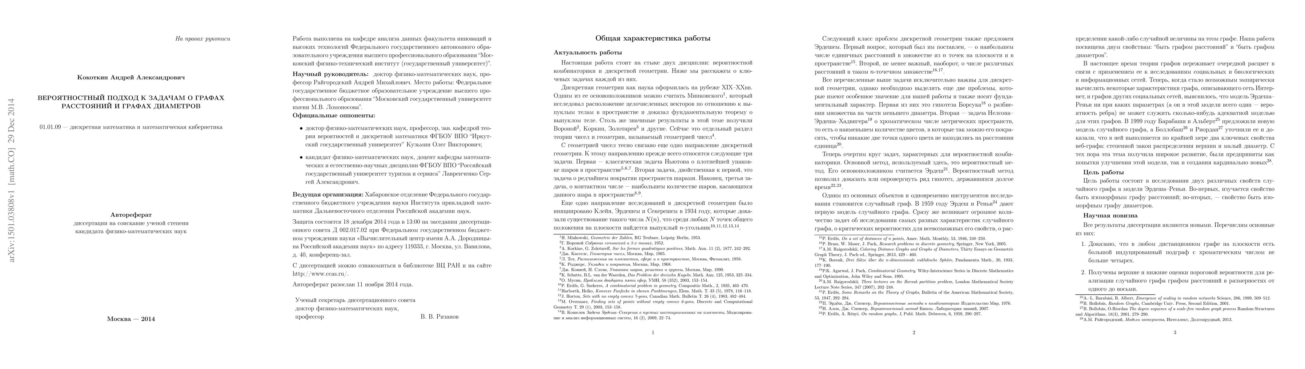 The dissertation is related to combinatorial geometry with a strong probabilistic flavor. The main results can be split into three parts. The results of the first part guarantee that each "unit distance graph" in the plane has an induced subgraph with chromatic number at most 4 that covers at least 91.7 percent of the vertices of the whole graph. The results of the second and third parts are related to the standard model of a random graph with n labeled vertices in which the edges occur independently with probability p, where p is a function of n. This is known as the Erdos--Renyi model G(n,p). Given a monotone property of a graph, Erdos and Renyi's theorem (1960) states that there exists a critical threshold value of p(n) below which the probability that a random graph has that property tends to one (as n tends to infinity) and above which the probability tends to zero. The main results of the second part are concerned with the (monotone) property of a graph to be isomorphic to some unit-distance graph in Euclidean d-space with fixed dimension d. The results of this part guarantee that for d in {2, 3, 4, 5, 6, 7, 8}, the threshold value of p(n) is big-Theta of 1/n. Furthermore, the case d = 1 stands apart from the case of higher dimensions; here the threshold probability is big-Theta of 1/(n^(4/3)). The results of the third part are devoted to studying "graphs of diameters" from the probabilistic standpoint. In particular, it is shown that under some conditions, almost all graphs of diameters in the plane have chromatic number less than 3. More generally, it is shown for G(n,p) that graphs of diameters have a tendency to chromatic degeneration (for large n) when p is close to 0, but have a tendency to completeness when p is close to 1.